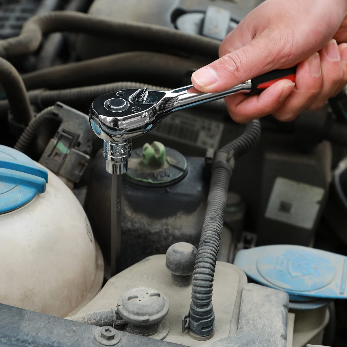 Q: Is the CASOMAN Hex Bit Socket Set compatible with standard 3/8 inch drive ratchets?A: Yes, the CASOMAN Hex Bit Socket Set features a 3/8 inch drive, making it compatible with standard 3/8 inch drive ratchets and extensions.
