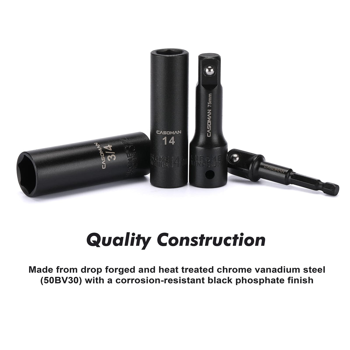 Q: What materials are used in the CASOMAN 25PCS 1/2" Drive Impact Socket Set?A: The CASOMAN 25PCS Drive Impact Socket Set is made from drop forged and heat treated chrome vanadium steel, providing durability and strength, complemented by a corrosion-resistant black phosphate finish.