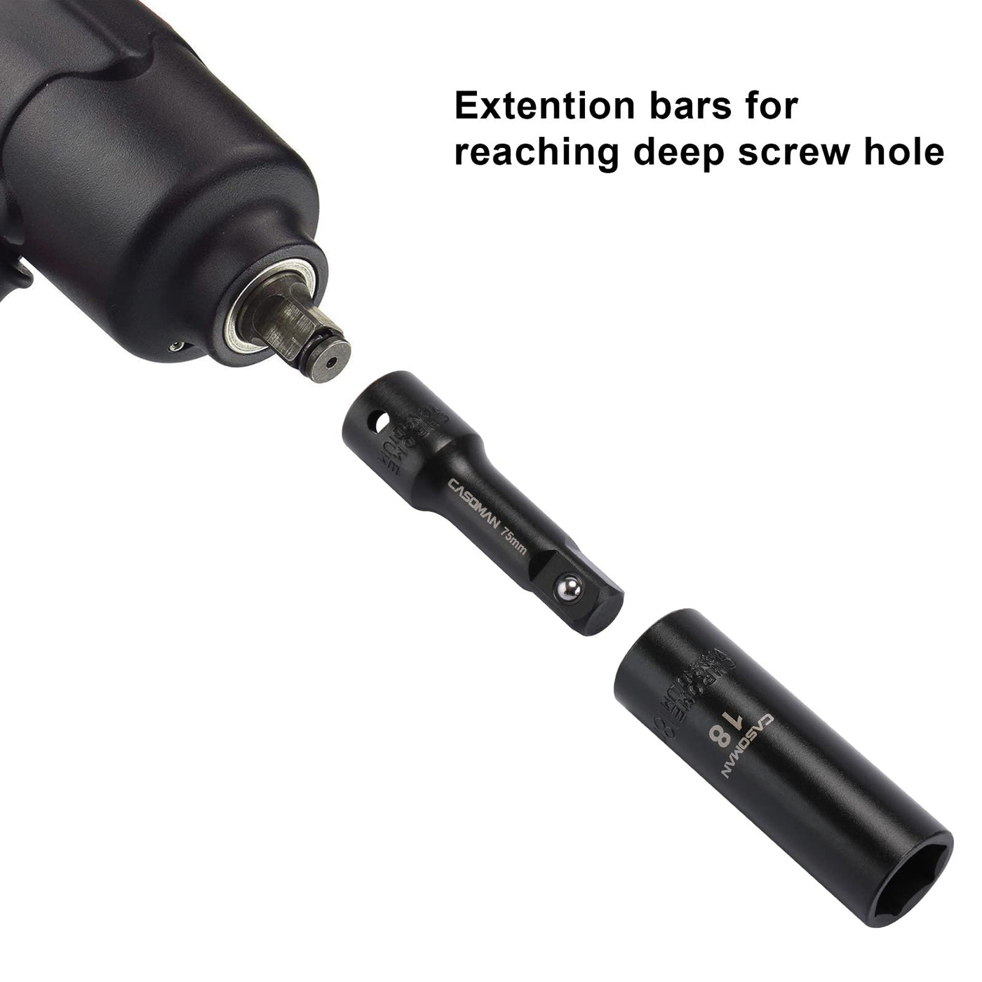 Q: Does this socket set come with any additional accessories?A: Yes, the CASOMAN socket set includes extension bars in 3-inch and 5-inch lengths, as well as a 1/2-1/4 adapter, making it versatile for different applications and access to tight spaces.