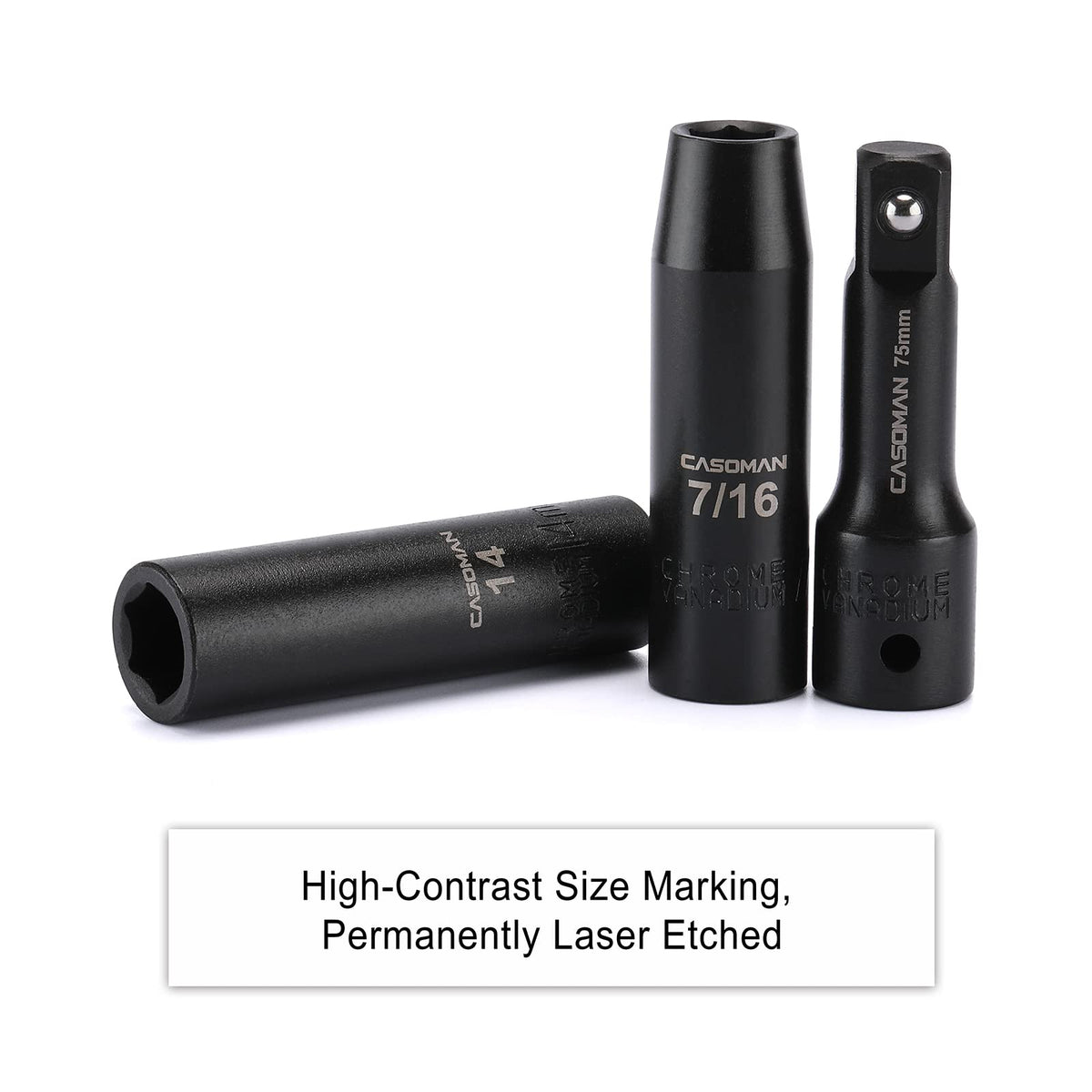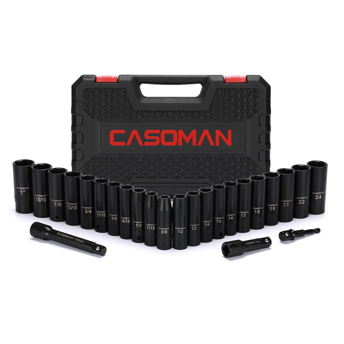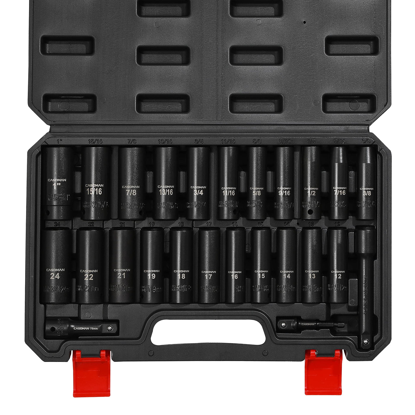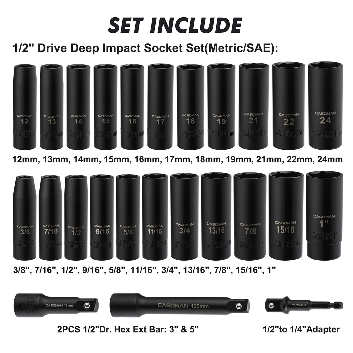CASOMAN 25PCS 1/2' Drive Impact Socket Set, Deep, Cr-V Steel, 6 Point, Metric&SAE, 12mm to 24mm, 3/8 Inch to 1 Inch, Includes Extension Bars: 3-inch, 5-inch, 1/2-1/4 adapter