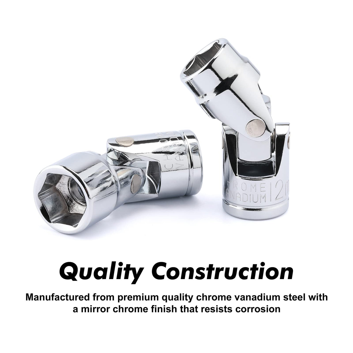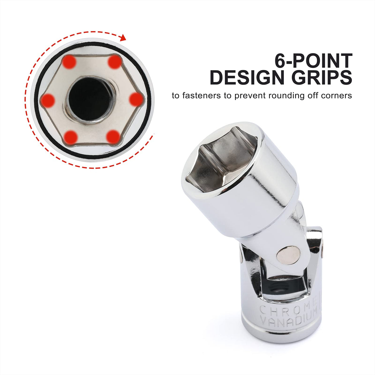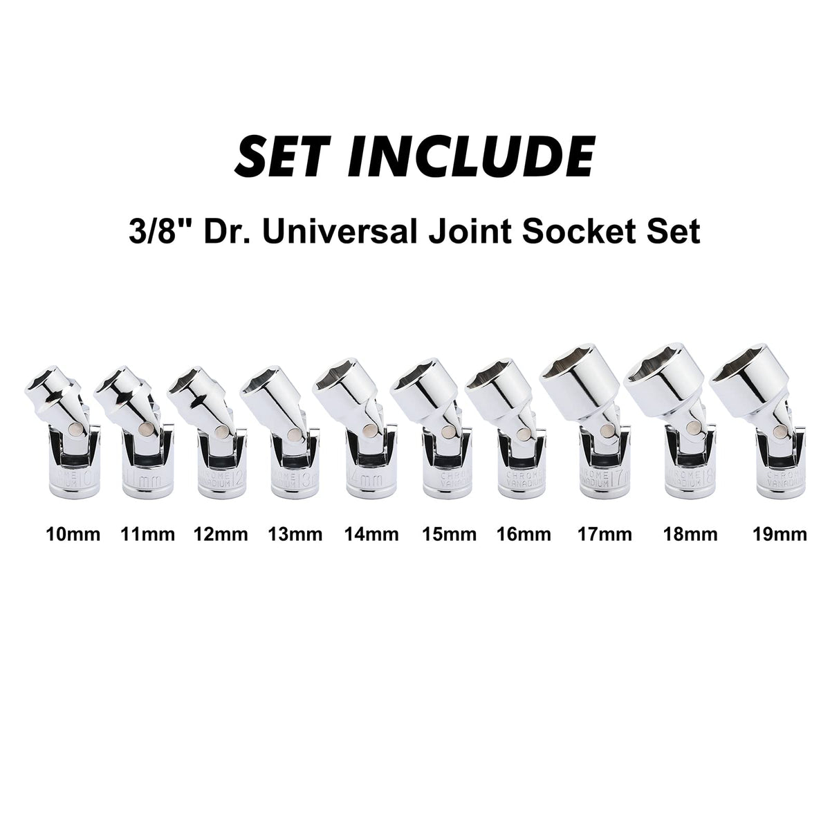 CASOMAN 3/8' Drive Universal Joint Socket Set- 10 Piece Flex Socket Set, 6-Point, Cr-V, Metric, 10-19mm, Manufactured from Heavy-duty Chrome-Vanadium steel alloy (50BV30) with corrosion-resistant mirror chrome finish. 6-point opening grips flat sides of fasteners, not corners, preventing round-off, The set can gain access to fasteners hard to reach and changing angle of force.