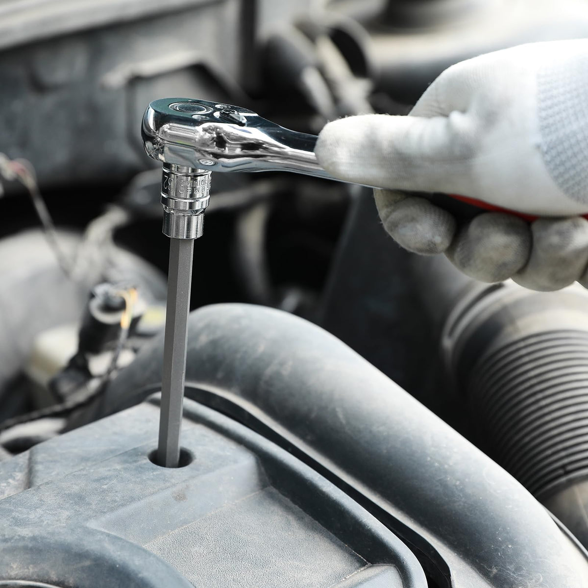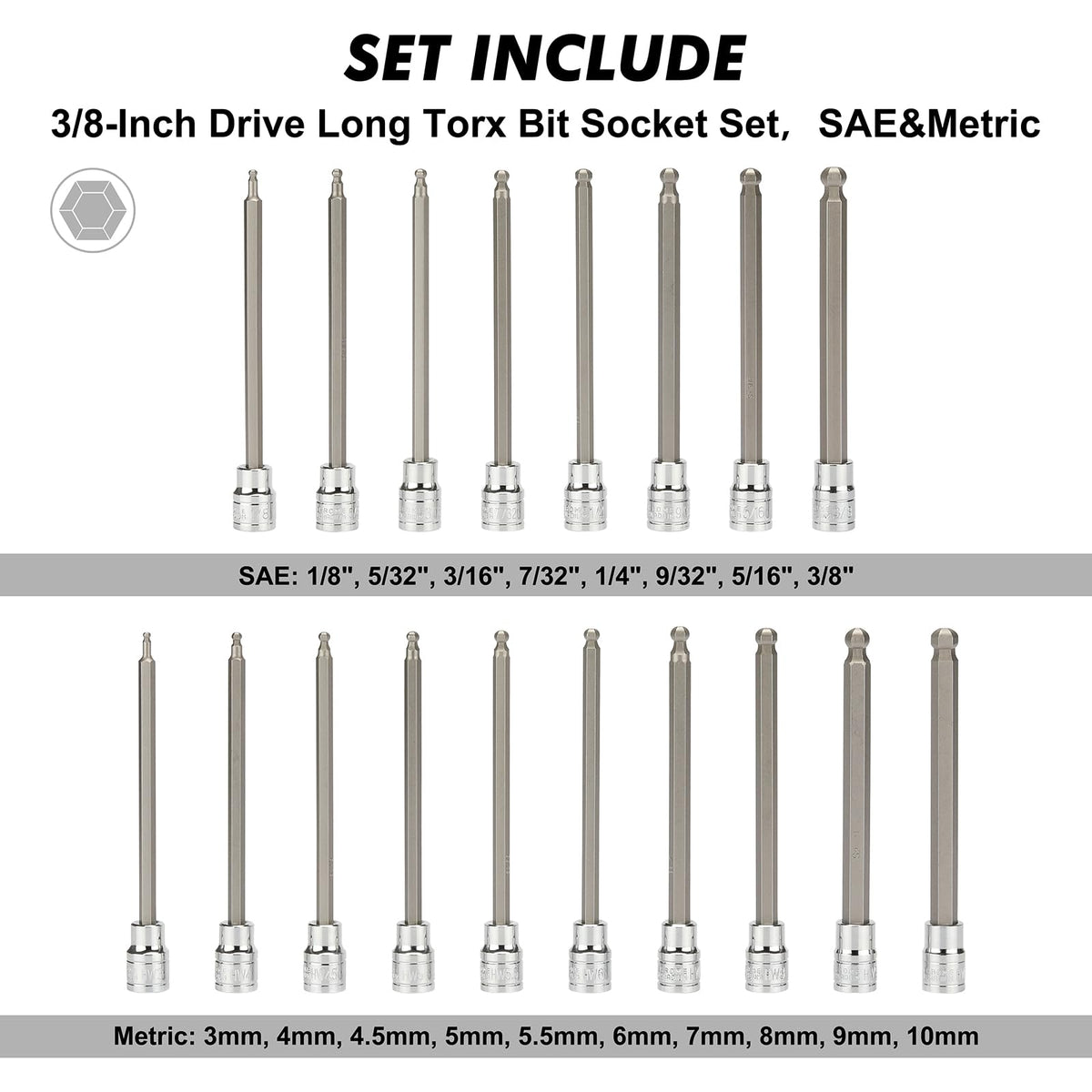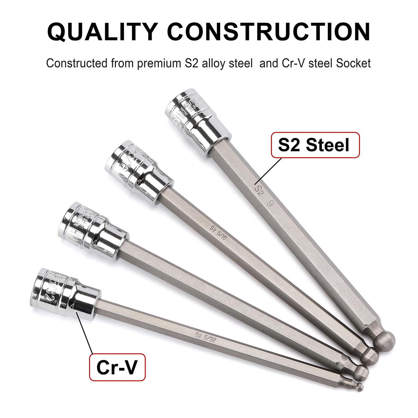 CASOMAN 3/8'Drive Extra Long Ball-End Hex Bit Socket Set's Bits made of premium S2 alloy steel for superior hardness and insure longevity, Cr-V steel sockets provide superior torque for greater turning power. Precision Machined Ball End, capable of inserting fasteners from multiple angles, quickly work around obstructions. Extra-long design allow bit to reach deep into especially narrow, recessed areas. Large, clear die-stamped size marking is easy to read and can’t wear off.