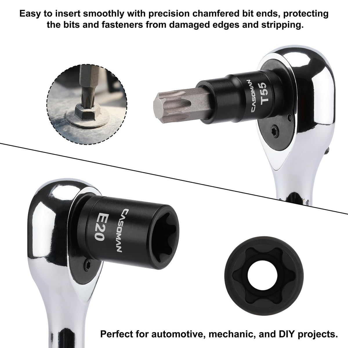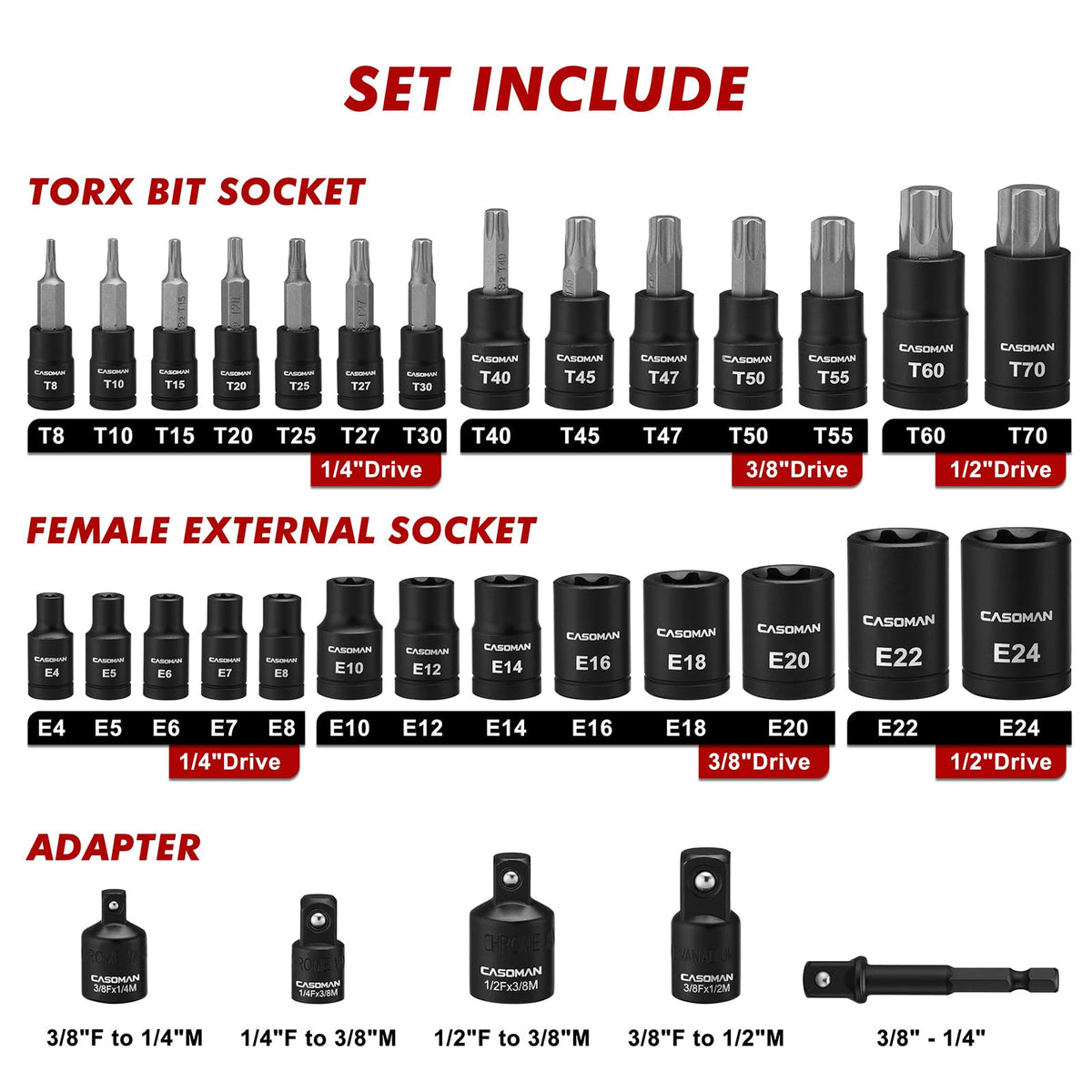 CASOMAN 32-Piece Torx Bit Socket and Female External Socket Set, 14 Star Bits (T8- T70) and 13 Female E-Torx Sockets (E4-E24), Include 5 Impact Socket Adapter