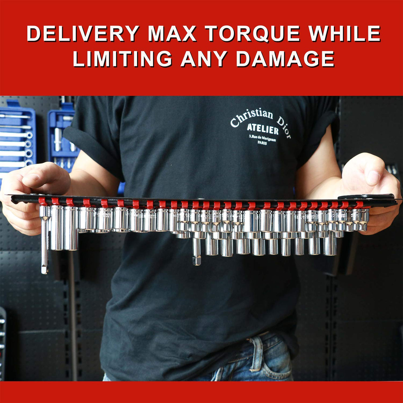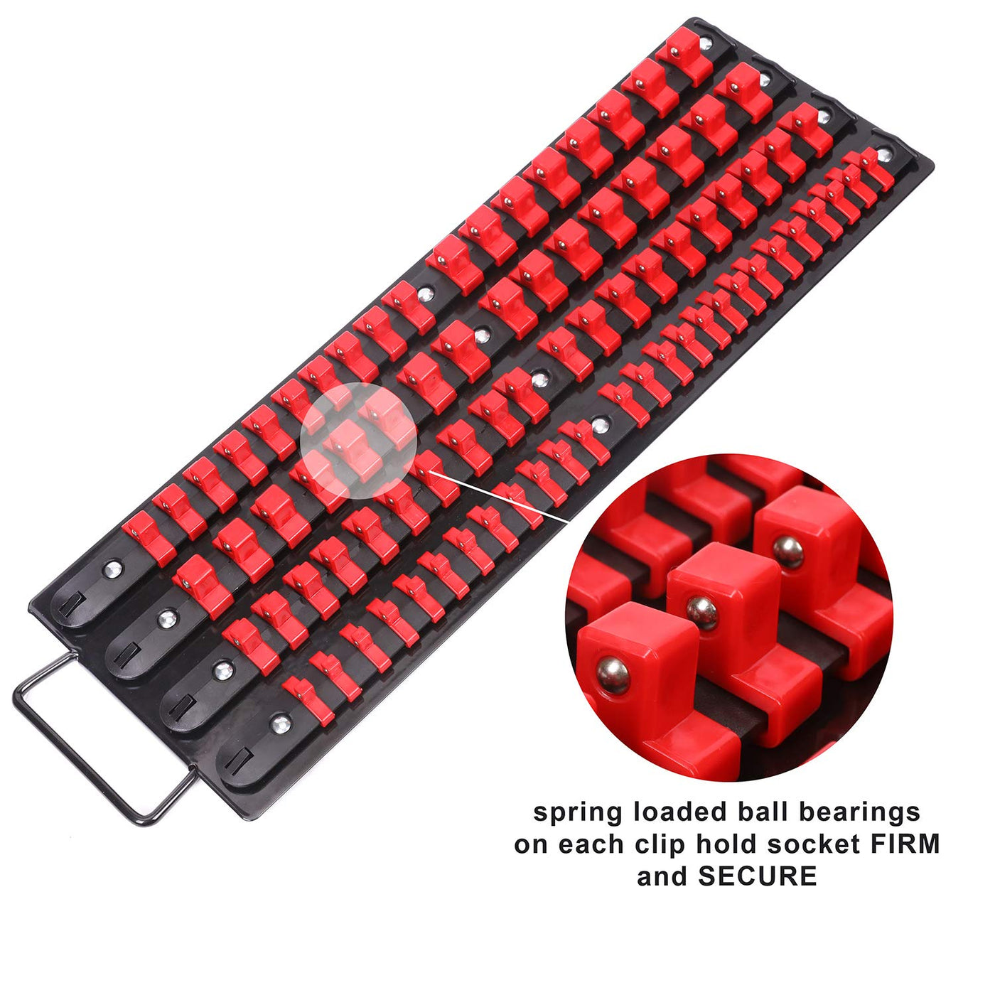 Heavy duty durable socket holders made of quality material (ABS rails and clips, steel tray), last for years | Spring loaded ball bearings on each clip hold sockets firm and secure. | Holds up to 80 sockets: 26 x 1/4' clips, 30x 3/8” clips, 24 x 1/2' clips. | A quick and easy way to organize cluttered toolboxes and work areas. | Works with all shallow or deep, Metric or SAE (Inch) Drive sockets.