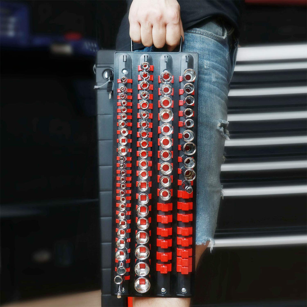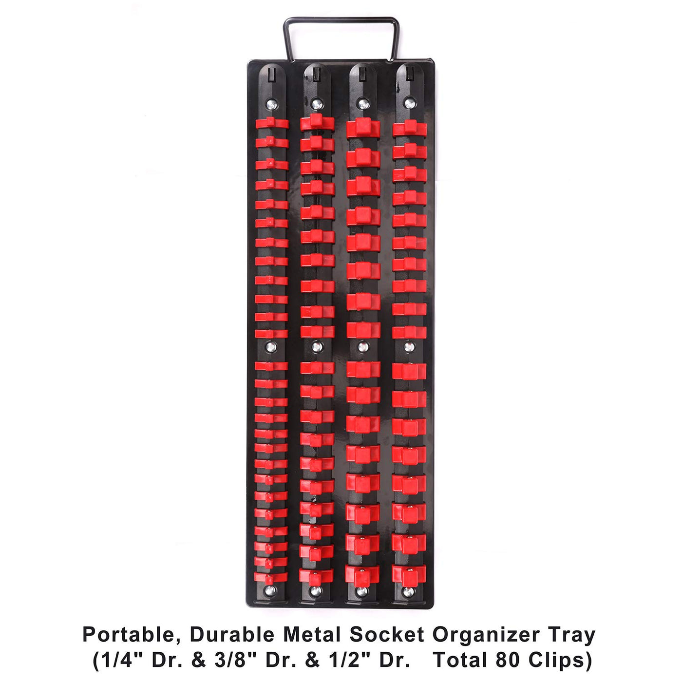 CASOMAN 80-Piece Portable Socket Organizer Tray, 1/4-Inch, 3/8-Inch, 1/2-Inch,Heavy Duty Socket Rail, Black Rails with Red Clips