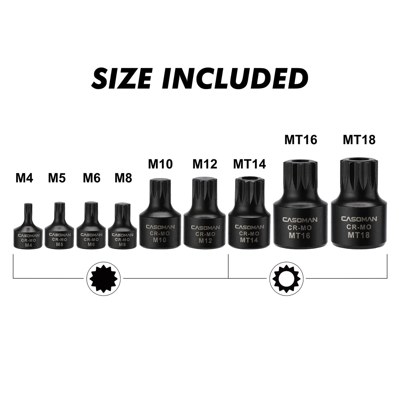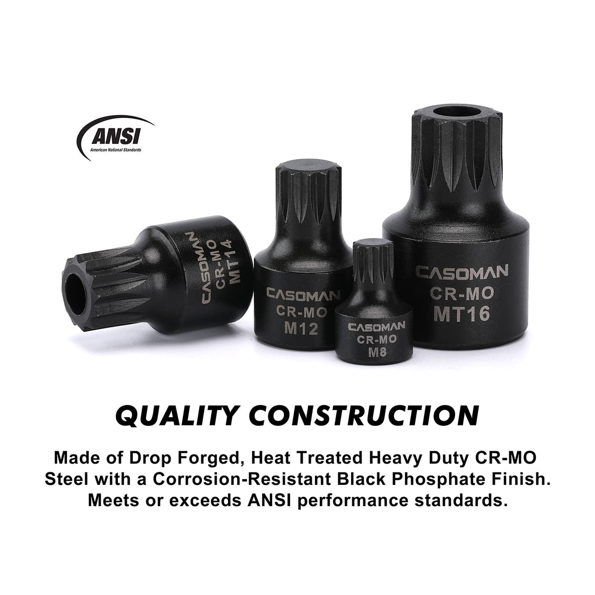 DescriptionCASOMAN 9-Piece Low Profile Impact Triple Square Bit Socket Set made of drop forged, heat treated chrome molybdenum steel with a corrosion-resistant black phosphate finish. Designed for Impact grade strength, low profile design for confined, hard to reach areas. Insert smoothly with precision chamfered bit ends. High-contrast size marking is permanently laser and easy to read, even in low light.Meets or exceeds ANSI performance standards. It comes with 1 year quality warranty.CASOMAN is a professional manufacturer of hand tools,rachet and all kinds of sockets products. We save customer's cost in each step of our operation,with a guarantee of high-quality and reliability. We delivery the most saving and best value to our customers.Choose the CASOMAN products and you will never worry about overpaying or any after sale service. All CASOMAN products come with 1 year quality gurantee.