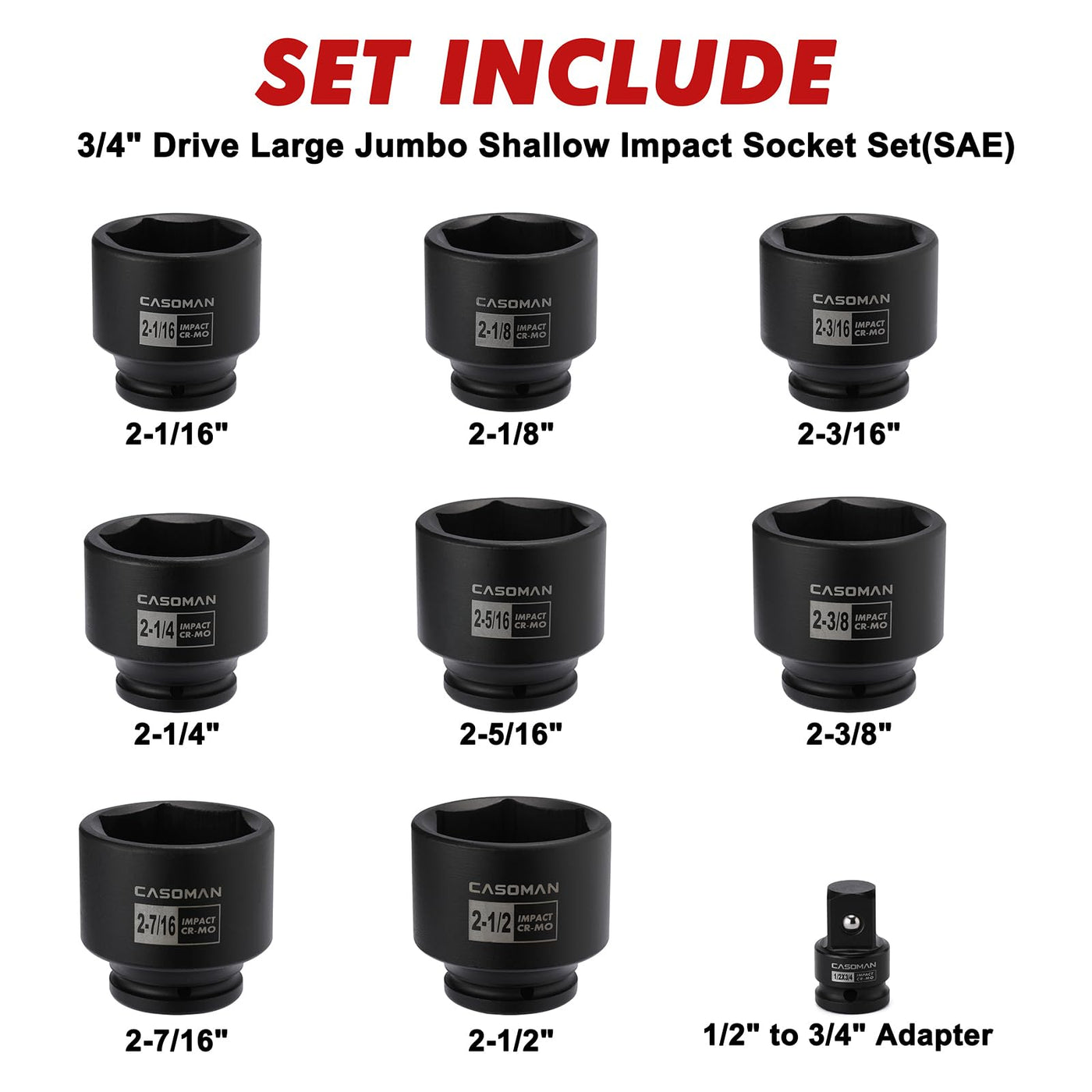 Q: What sizes are included in the CASOMAN 9PCS 3/4" Drive Spindle Axle Nut Impact Socket Set?A: The set includes the following sizes: 2-1/16", 2-1/8", 2-3/16", 2-1/4", 2-5/16", 2-3/8", 2-7/16", and 2-1/2". It also comes with a 1/2" to 3/4" adapter for added versatility.