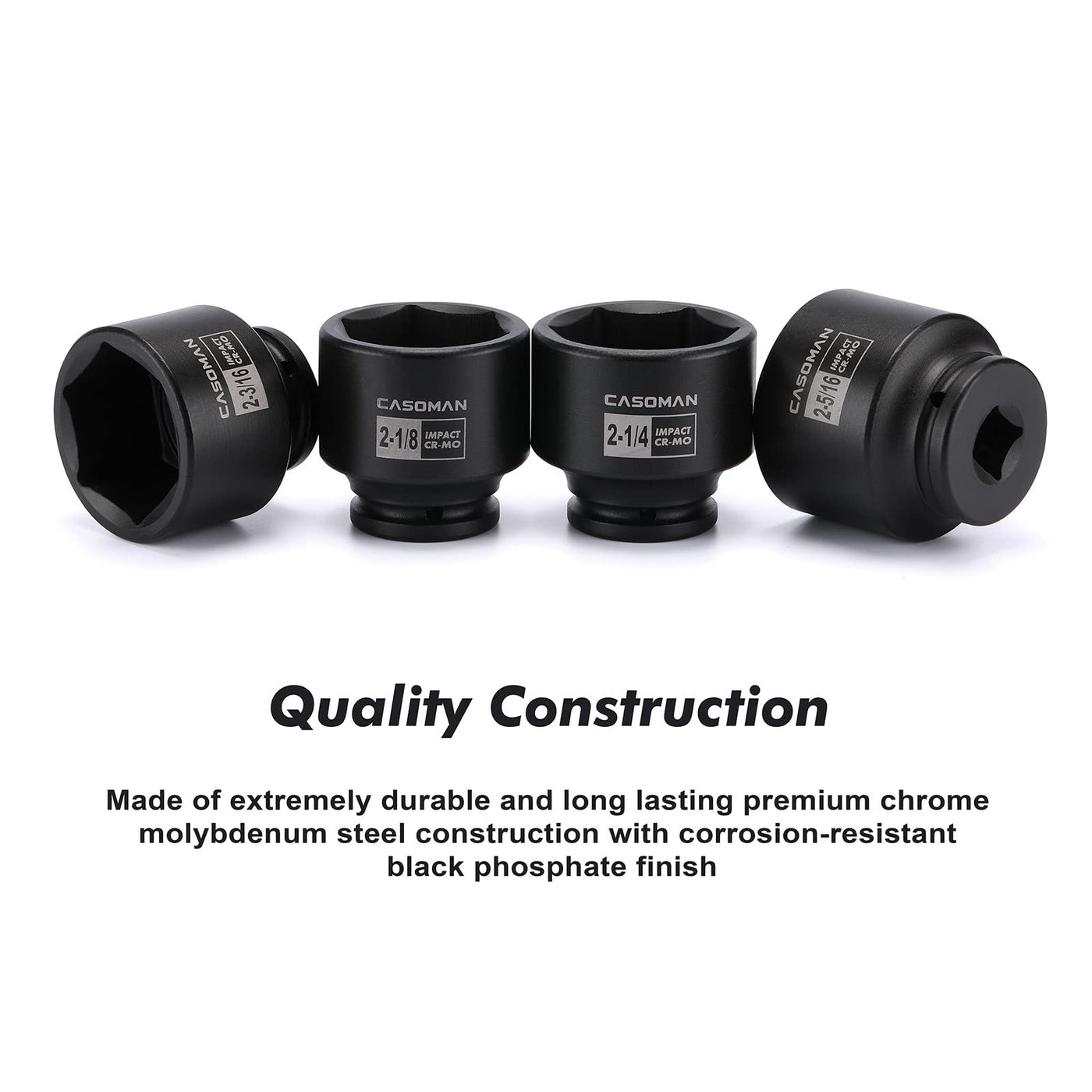 Q: What material is the CASOMAN socket set made from?A: This socket set is made of Drop Forged, Heat Treated Heavy Duty Chrome Molybdenum (CR-MO) Steel, which provides excellent durability and strength for heavy-duty use.