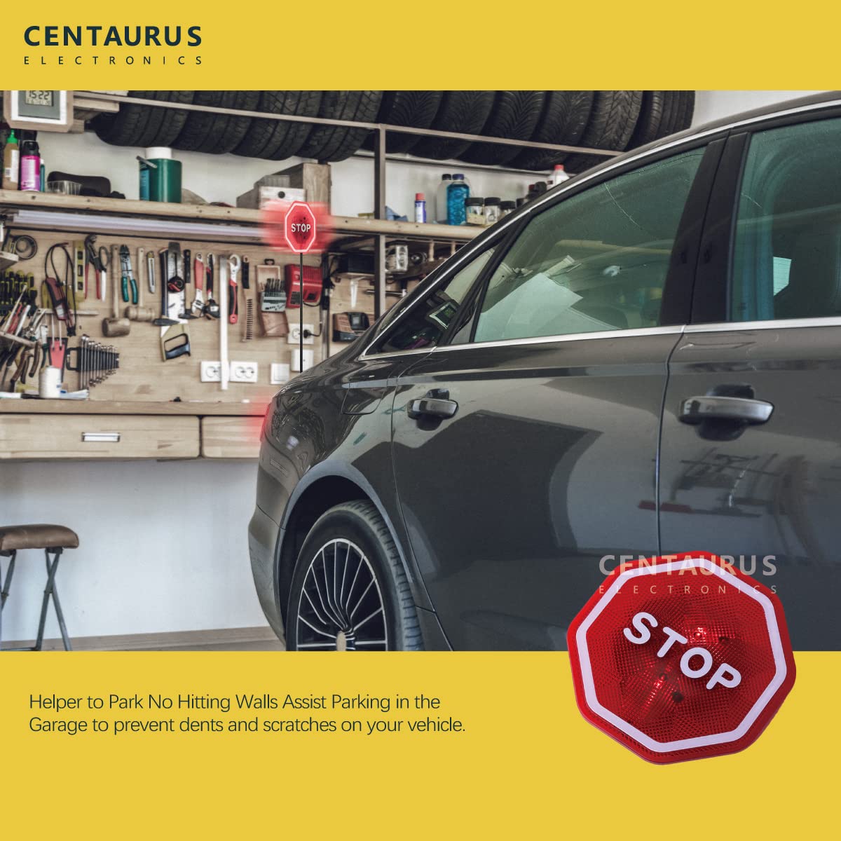 Q: How does the CENTAURUS Garage Parking Assist work?A: The CENTAURUS Garage Parking Assist uses flashing LED lights to indicate when your vehicle is getting too close to the stop sign. When your car's bumper makes contact with the pole, the LEDs will flash, helping you park safely and avoid damage to your vehicle.