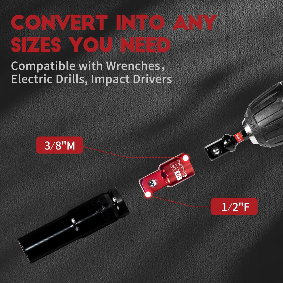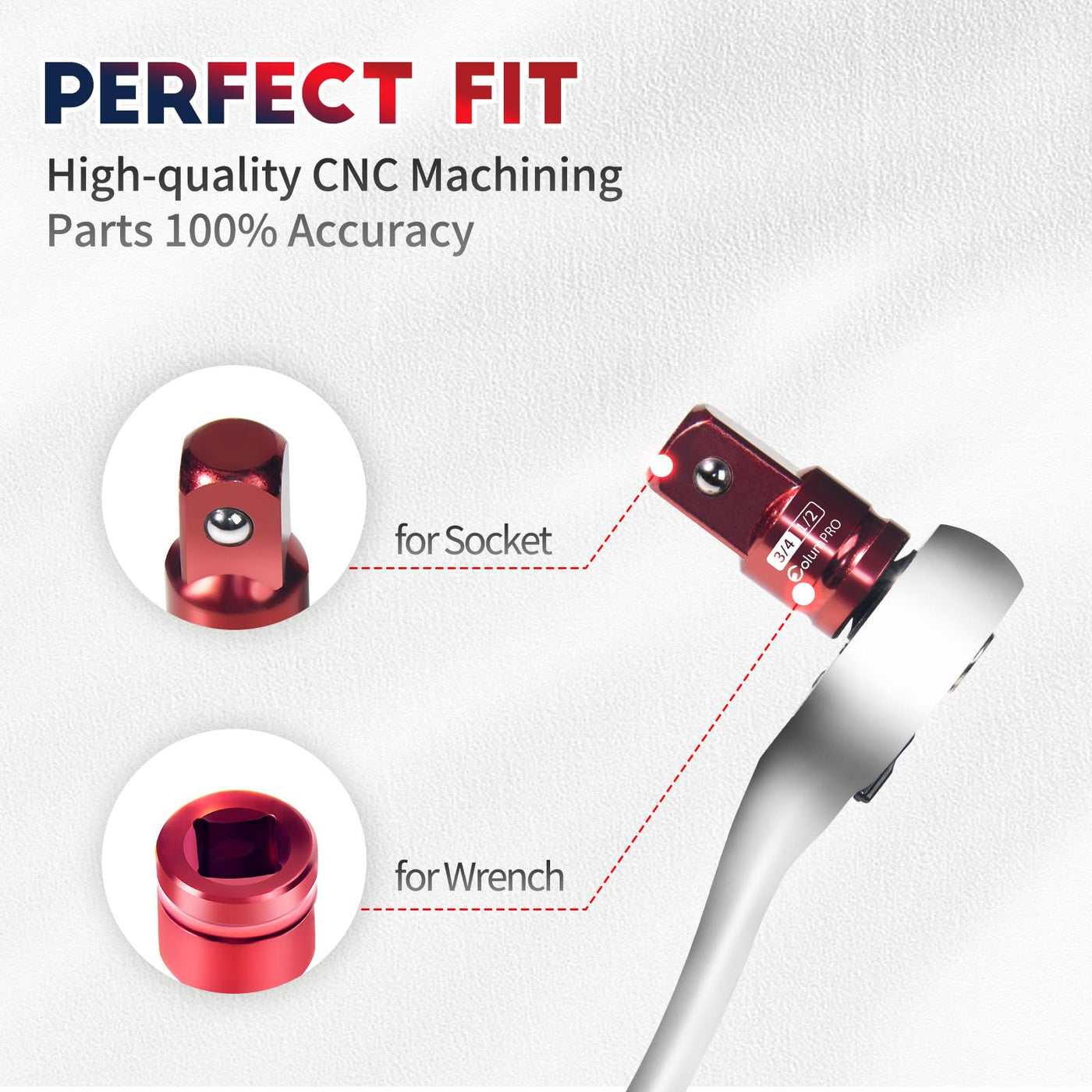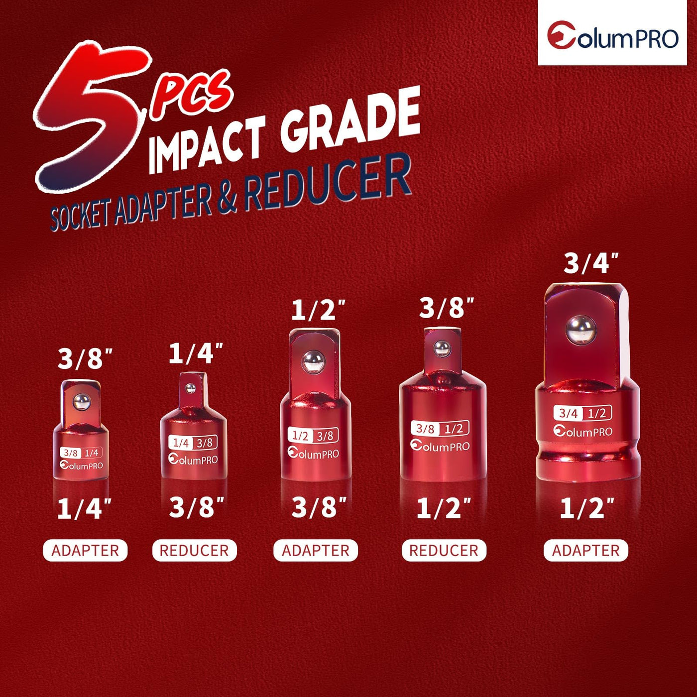 ?ONE SET FOR ALL NEEDS?Our socket adapters set includes 5 different SAE sizes, 1/2”F to 3/4”M,1/2”F to 3/8”M, 3/8”F to 1/2”M, 3/8”F to 1/4”M, 1/4”F to 3/8”M. These adapters cover every size you need for socket-related work. | ?High Quality?These socket adapters are made from high quality chrome vanadium steel with chrome plated finish for exceptional durability and resistance to rust. ColumPRO wrench adapters will stand up to any task you give them and to last. | ?Practical Use?These socket adapters can be used on impact drivers, wrenches, ratchets, cordless drills and power drills. A variety of sizes that could convert your tool to fit the exact size of the socket. ColumPRO socket adapter converters and reducers are a great tool set for your tool collection, suitable for car and engine repair, rebuilding, DIY, construction. | ?Performance?These socket adapters are meant for heavy duty use. They are designed to absorb the high torque of impact drivers. The tapered square head allows the socket to easily fit in and out, and the spring-loaded ball ensures the sockets lock securely. | ?SPECIAL COLAR?ColumPRO impact socket adapters have red painting, unlike other adapters, which will stand out in your tool collection, can be found at a glance. So that you could pick the right tool whenever you need them and the laser mark sizes are instantly recognizable for which to use, making your work more efficient.