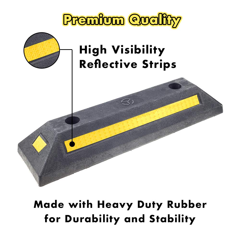 Q: How does the parking stopper enhance safety while parking?A: This parking stopper features bright yellow reflective stripes that improve visibility, making it easier for drivers to see the stopper even in low light conditions. This helps prevent accidents and ensures safe vehicle parking.