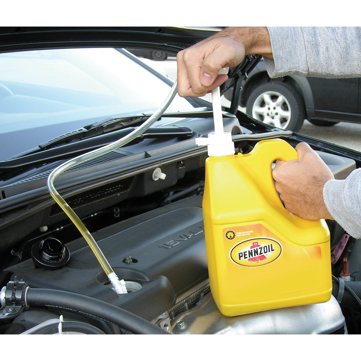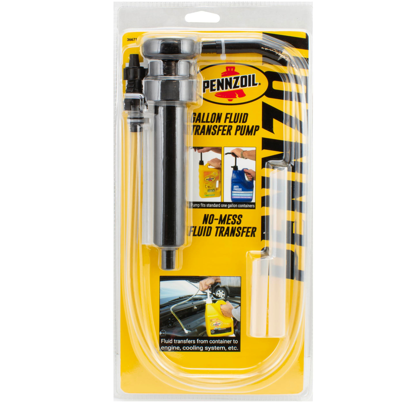 Transfer fluids safely with this Pennzoil® Fluid Transfer Pump. This easy to use pump transfers fluid between containers or, from containers to engine, cooling systems, and many more uses. It is ideal for vehicles, boats, motorcycles, RVs and any other vehicle with an engine. Fits gallon size containers.