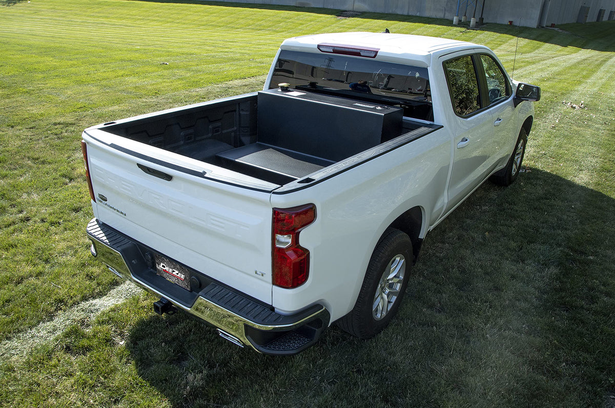 Q: What dimensions does the Dee Zee DZ92747SB transfer tank have?A: The dimensions of the Dee Zee DZ92747SB transfer tank are L: 46.75 inches, W: 32.75 inches, and H: 25.375 inches, designed in an L-shape for better compatibility with various vehicle configurations.