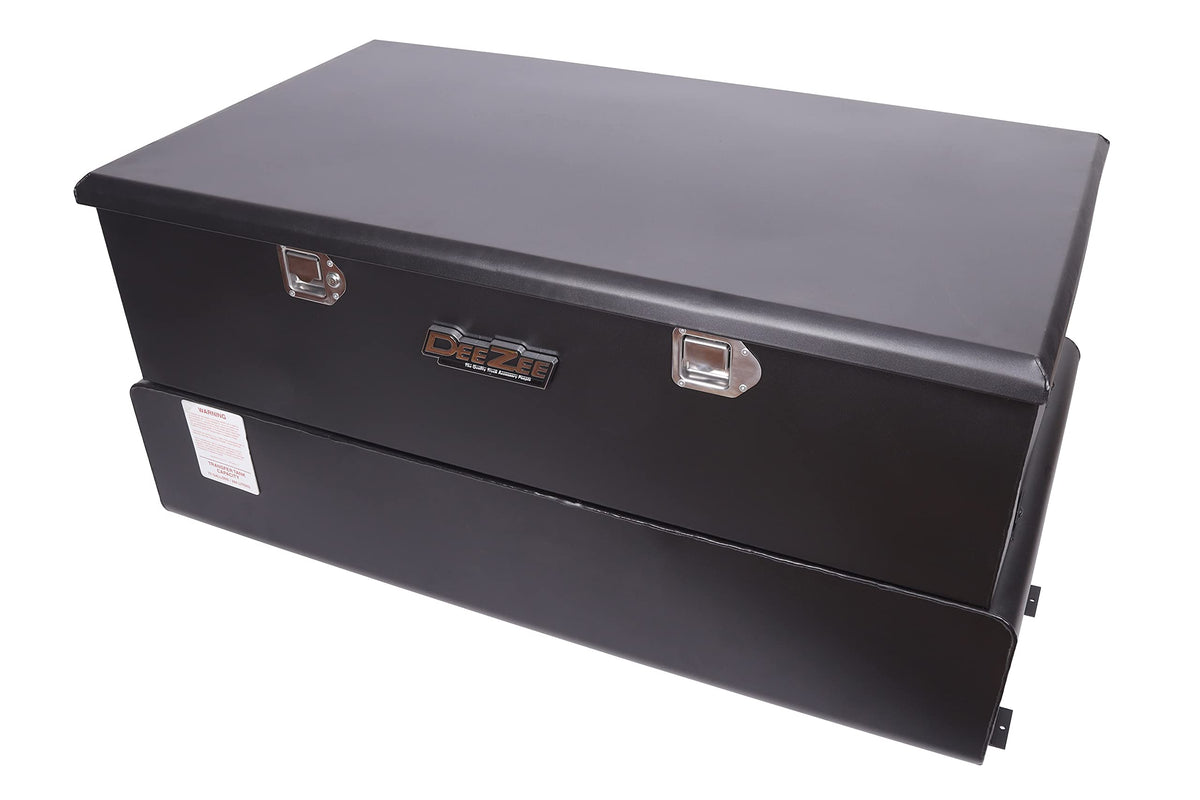 Dee Zee Combo Tanks - The convenience of a utility chest connected to a liquid transfer tank. Constructed of heavy duty 14 gauge steel. Black powder coat finish. Radius curve design eliminates key weld pressure points. Feature 3 stability baffles, lockable cap, 3/8 drainage plug, venting coupler, and a 15 gallons per minute pump in its own compartment inside the tool box. Intended for private use (non-commercial). Not designed for use as an auxiliary fuel system. Not for use with gasoline. Does not meet title 49 of the United Stated Federal Registry governing transportation.