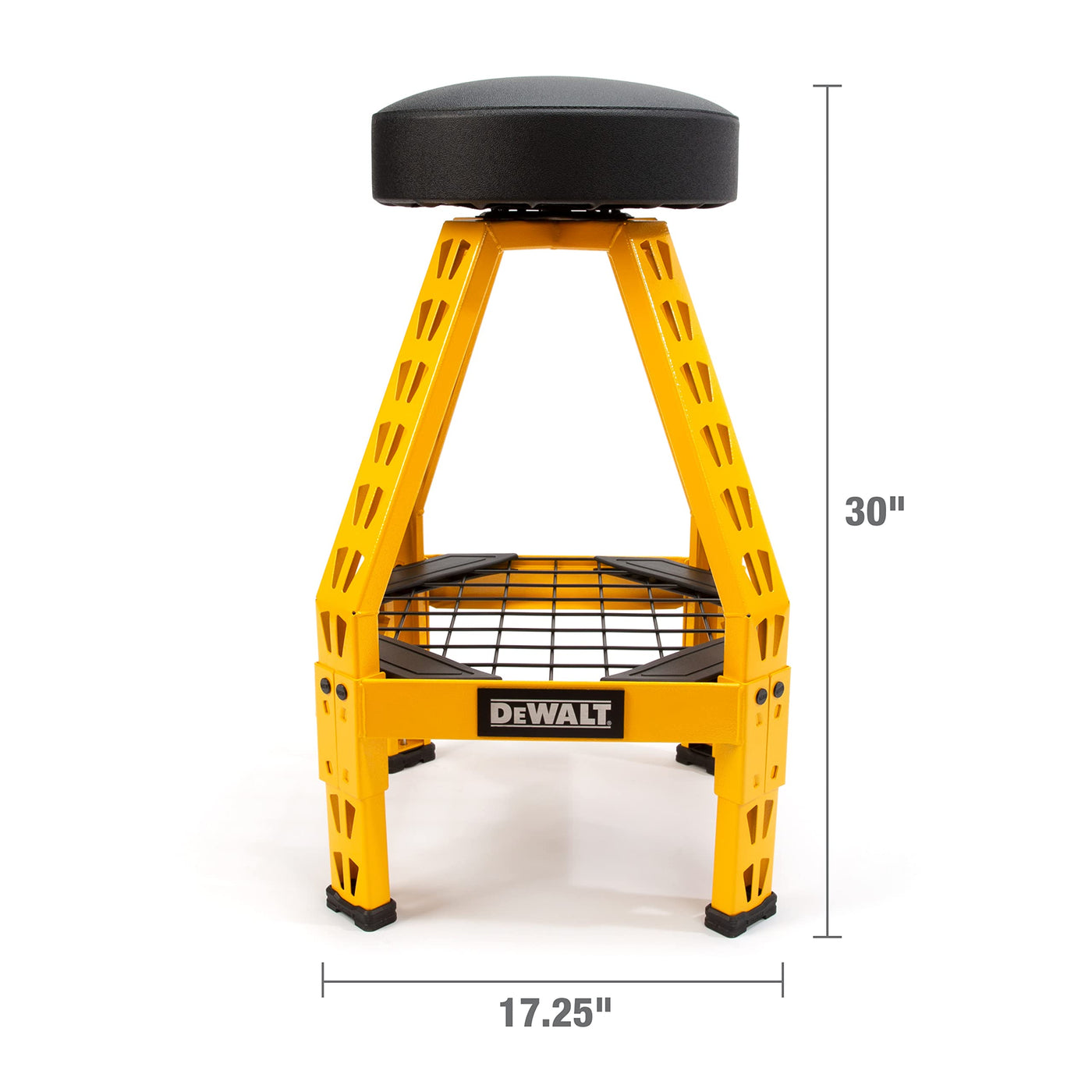 The DEWALT DXSTFH030 was designed and engineered to provide a heavy-duty stool fit for use in the busiest workshops and professional garages. This stool's legs and supports are built using the same powder-coated, industrial grade steel uprights and crossbeams as our 4-foot storage rack. The comfortable foam-padded seat sits atop a 360-degree swivel allowing free and easy rotation when seated and the textured vinyl cover resists rips and tears. A bracket-secured industrial wire grid lower shelf provides an ideal place to store necessary tools and supplies. Featuring an all steel frame construction this stool can easily hold up to 300 pounds without showing any signs of weakening or metal fatigue. This stool features a version of the rugged, glass-filled nylon feet used on the storage racks that has an adjustable levelling pad as part of the foot. Made of the same reinforced nylon material these levelling feet can be easily adjusted by hand to eliminate any wobbling of the stool in addition to preventing damage to the powder coat and finished flooring. The bolt-secured frame comes pre-assembled with only the seat needing to be attached before the stool is ready for use.