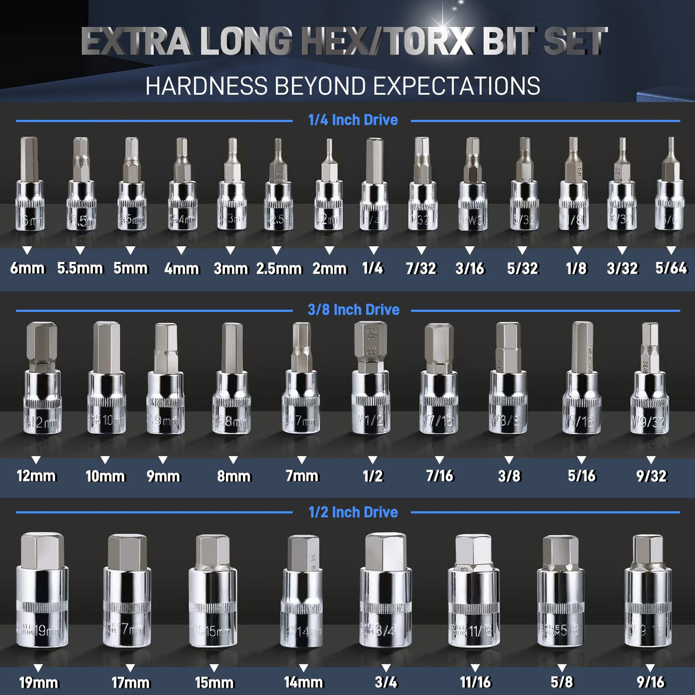 Q: What sizes are included in the DISEN HEX Bit Socket Set?A: The set includes both SAE and Metric sizes. It features 16 SAE HEX sizes ranging from 1/4 inch to 3/4 inch and 16 Metric HEX sizes ranging from 2mm to 19mm, offering versatility for various applications.