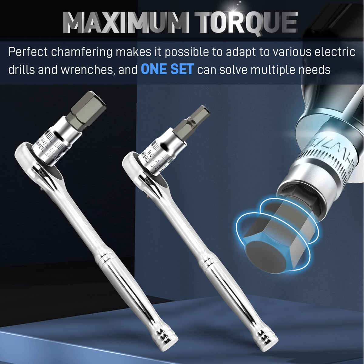 32 PCS HEX Bit Socket Set Features: Drop-forged, heat-treated S2 alloy steel, known for its supreme hardness Heat-treated Chrome Vanadium Steel, hardened to increased torque power. Each wrench size is printed on the tool box for easy sorting. Premium storage & carry case (stamped bits sizes for easier recognition). Mirror chrome plated surface anti-rust and anti-corrosion. Extend service life. Increased the contact area with the fastener, reduce wear, protect the fastener. Complies with ANSI standards. Widely used in cylinder head bolts, retaining bolts, drive train components, door hardware, disc brake calipers and other applications.