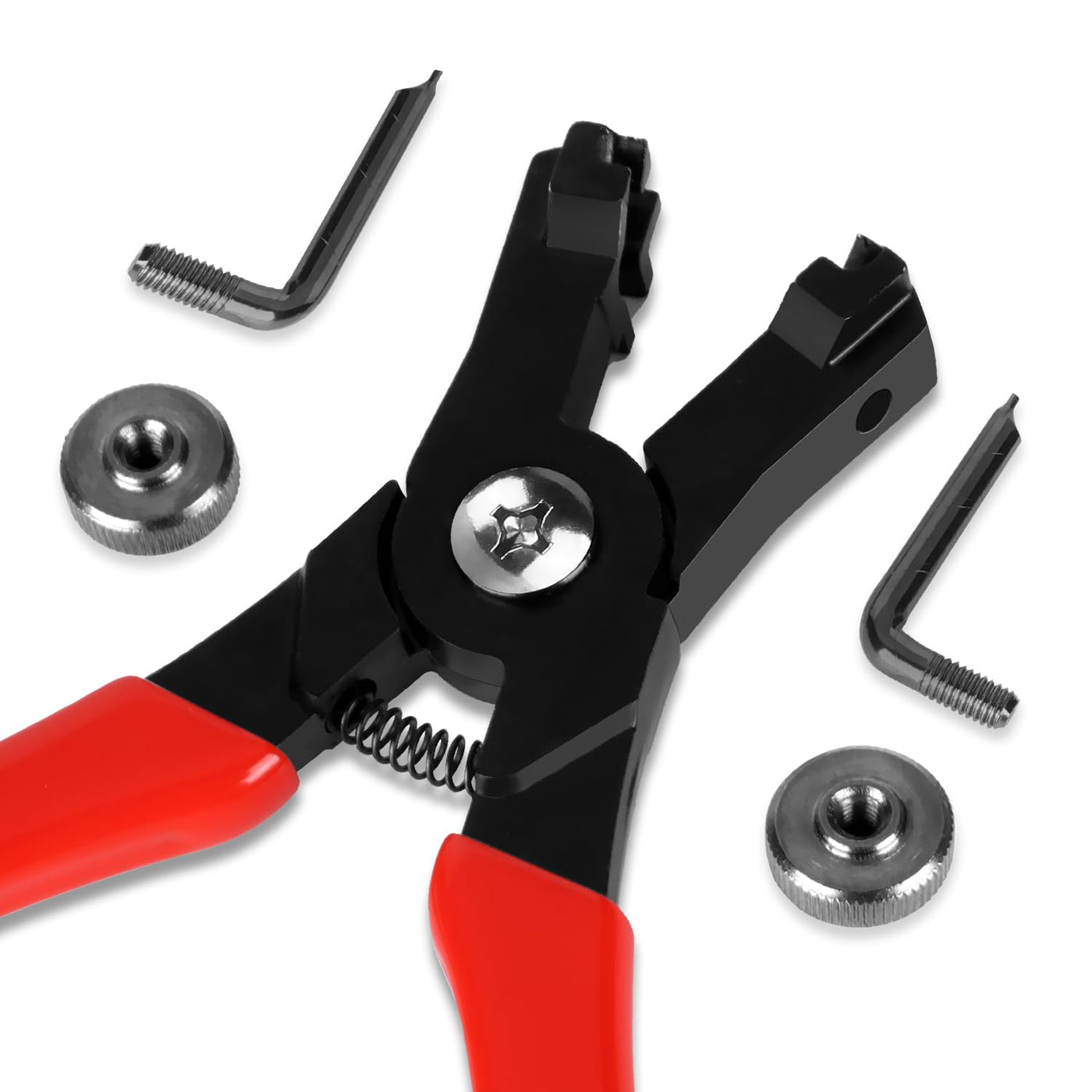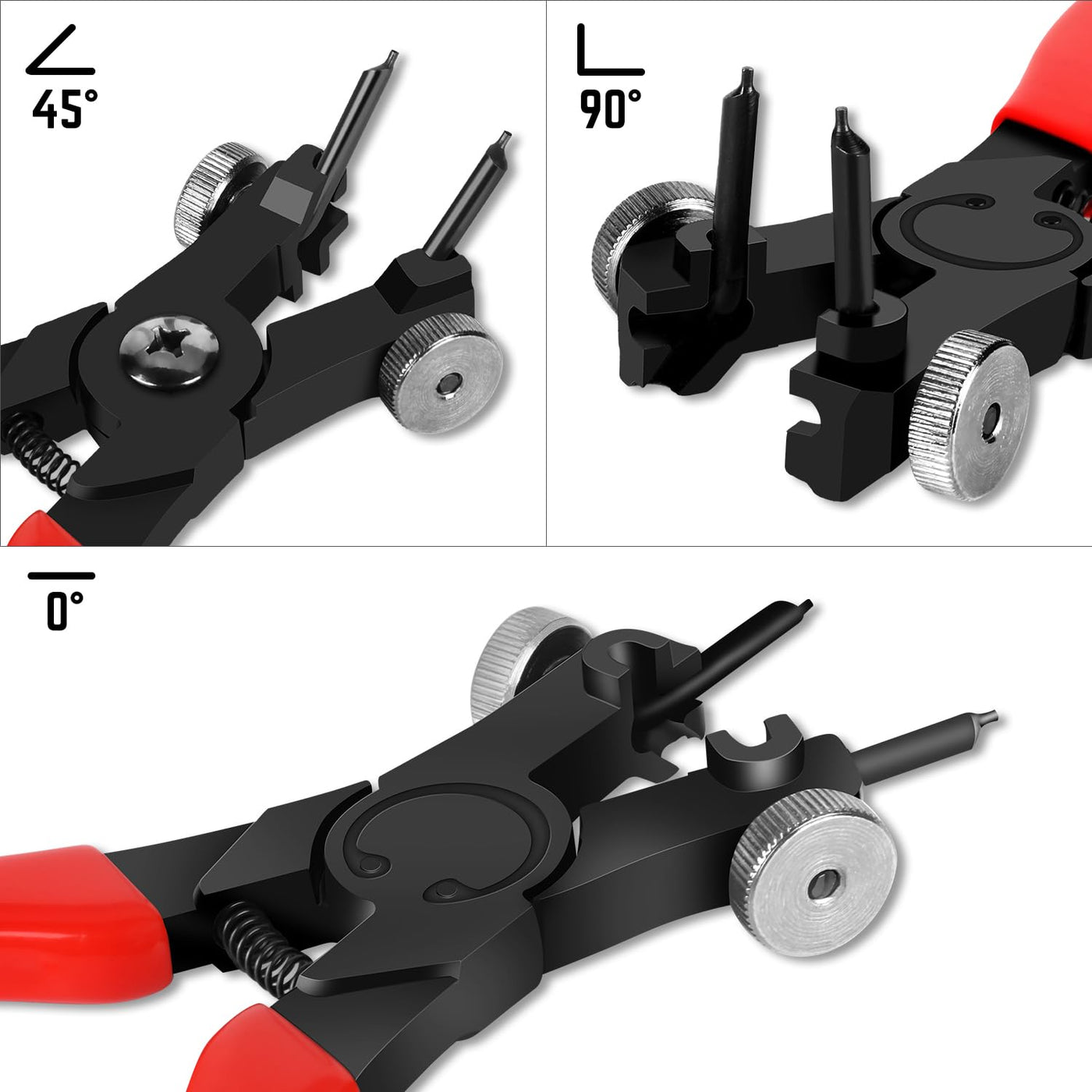 Q: How do I adjust the angle of the pliers for different tasks?A: You can easily adjust the angle of the DNA MOTORING Snap Ring Pliers by turning the nut, removing the pliers, repositioning the groove, and fixing it to complete your multi-angle application. This allows you to work at 180°, 90°, and 45° angles without needing to replace the pliers head.