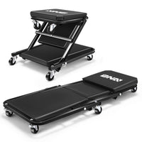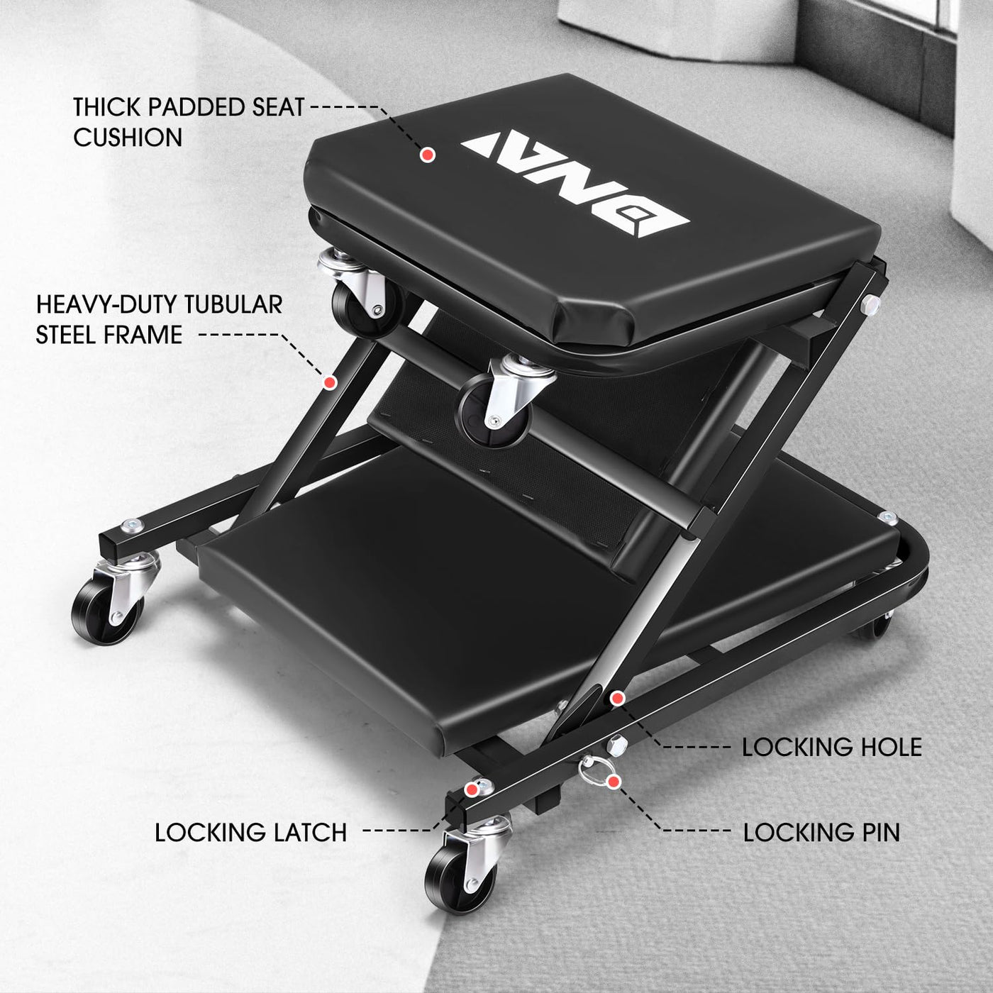 HIGH-QUALITY DNA TOOLS - Each item in our collection is the result of significant research and development, as well as rigorous automotive application testing and fitments carried out by our highly qualified specialists. We test the material's strength and durability to guarantee that the tools arrive completely prepared for their intended use at the consumer's end. | QUALITY CONSTRUCTION - Heavy-duty tubular steel fram promises to withstand the test of time. It boasts non-marring polyurethane swivel caster wheels provide effortless mobility. | ADVANCED DESIGN - This roller garage shop creeper with thick padded seat cushion will provide stability and comfort on the job. Unique design allows creeper to transform from a standard rolling creeper into a seat in seconds. | WORK EASIER - Designed with 6 swivel casters which deliver smooth and precise movements around your garage, making work routine take less time. | PRODUCT SPECIFICATIONS - The car creeper/seat has a maximum weight bearing capacity of 330 LBS(150KG) . It measures 35.2'' long, 16.33'' wide, and 3.54'' high; Allows you to work in your garage or workshop in comfort.