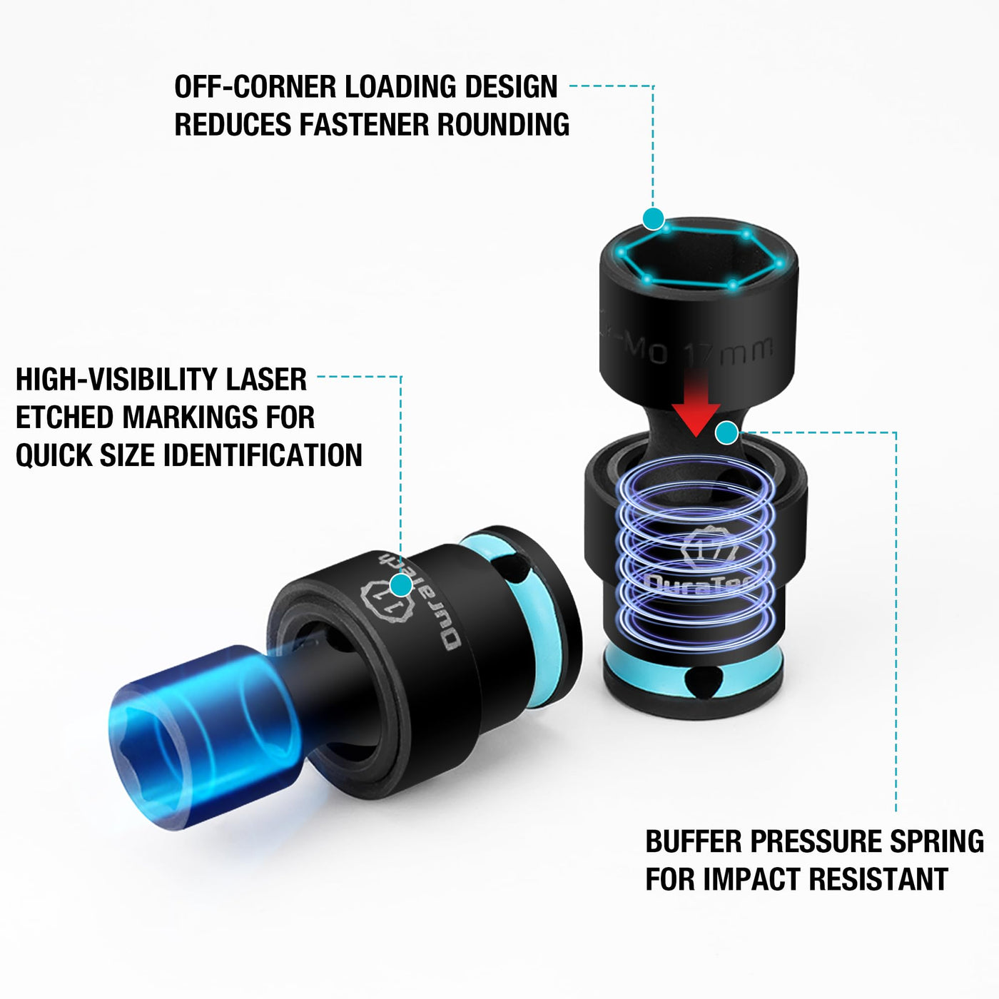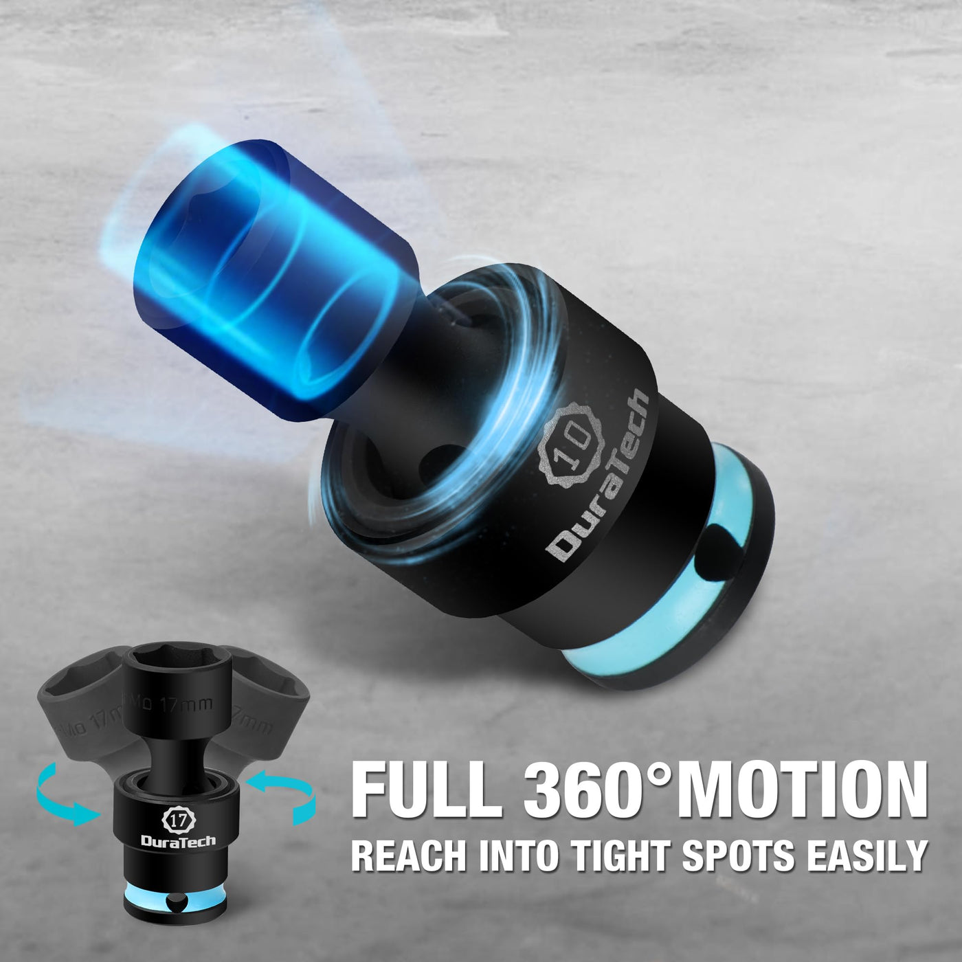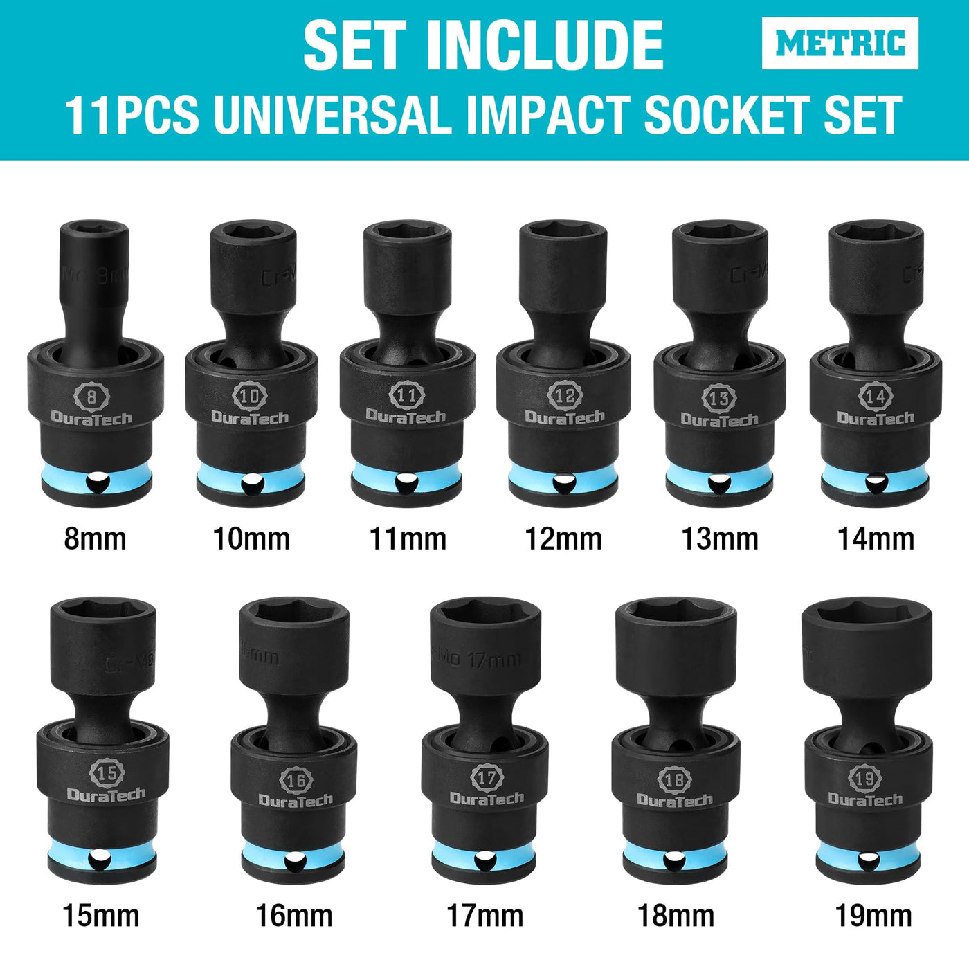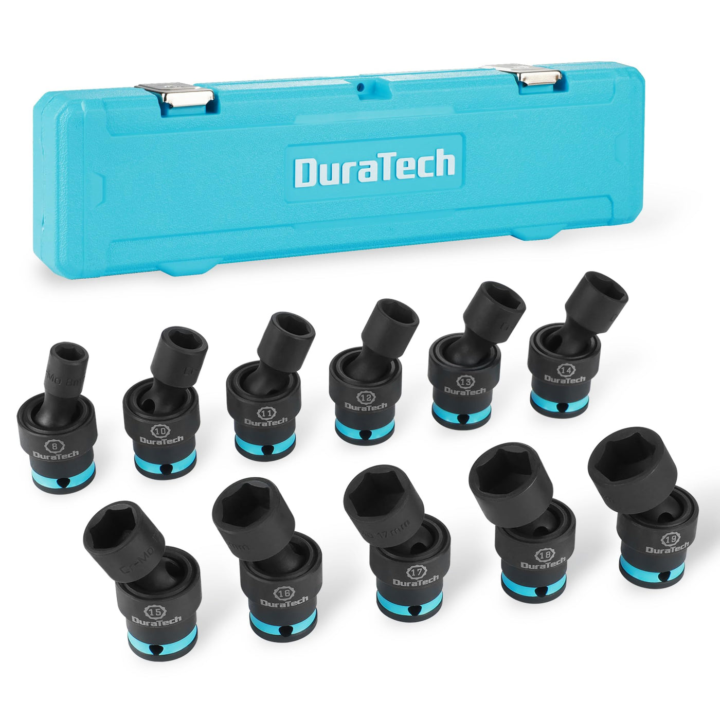 Duratech 3/8" Drive Impact Swivel Socket Set, 11-Piece Shallow Wobble Socket Set, Metric Socket Set With Flexible Wobble, Cr-Mo Steel, 6 Points, Organized In Sturdy Storage Case(8-19Mm)