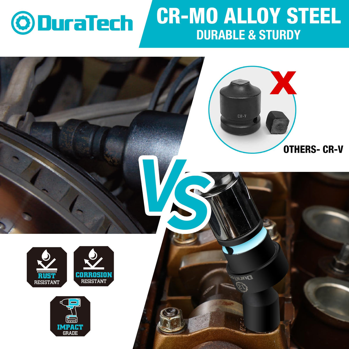 Q: What material is the DURATECH swivel socket set made from?A: The swivel socket set is made from premium impact-grade chrome molybdenum (Cr-Mo) steel, which provides excellent resistance to corrosion and high temperatures.