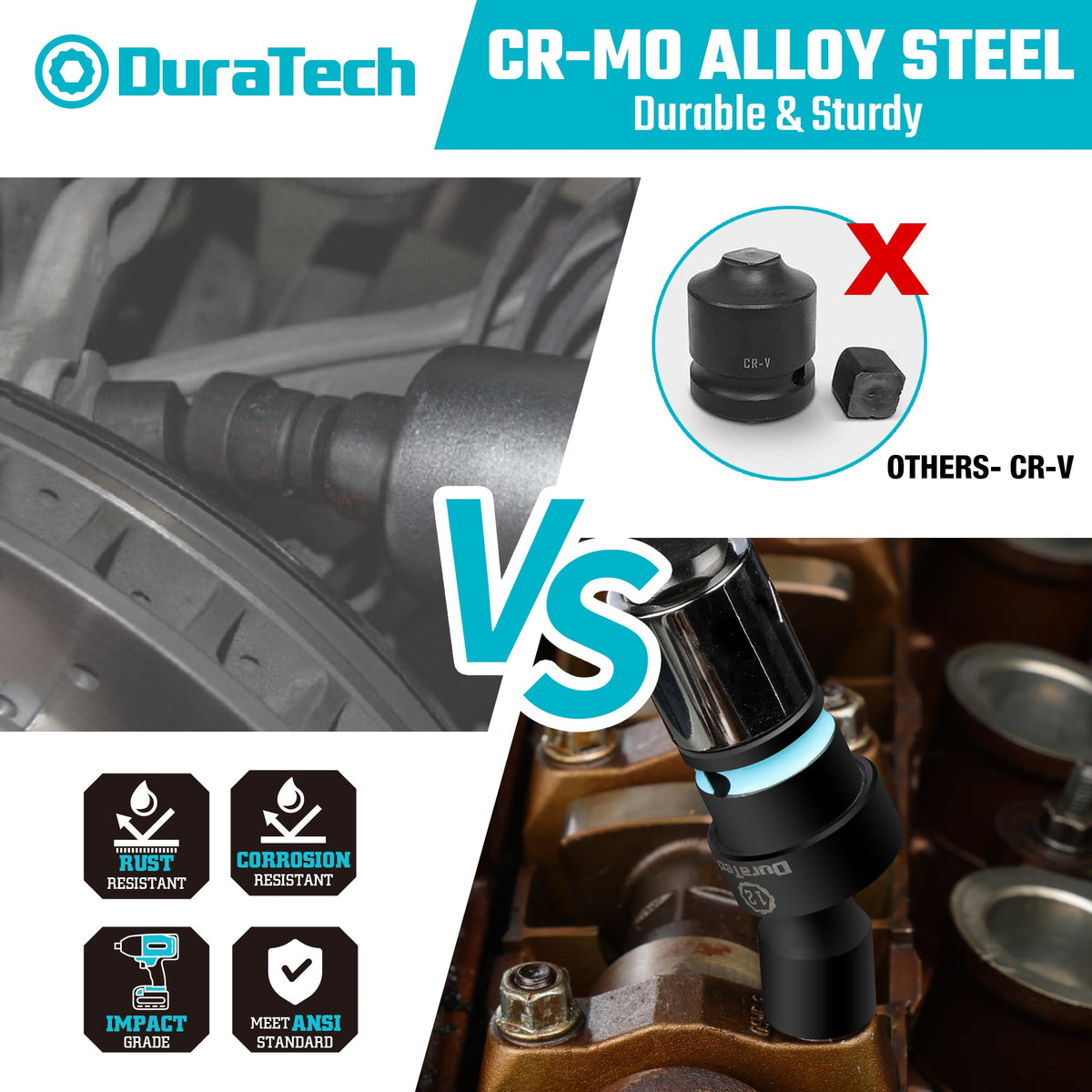Duratech 3/8" Drive Impact Swivel Socket Set, Shallow Universal Wobble Socket, Sae&Metric Socket Set With Flexible Joint, 14 Pieces, Cr-Mo Steel, 6 Points, Organized In Sturdy Storage Case