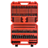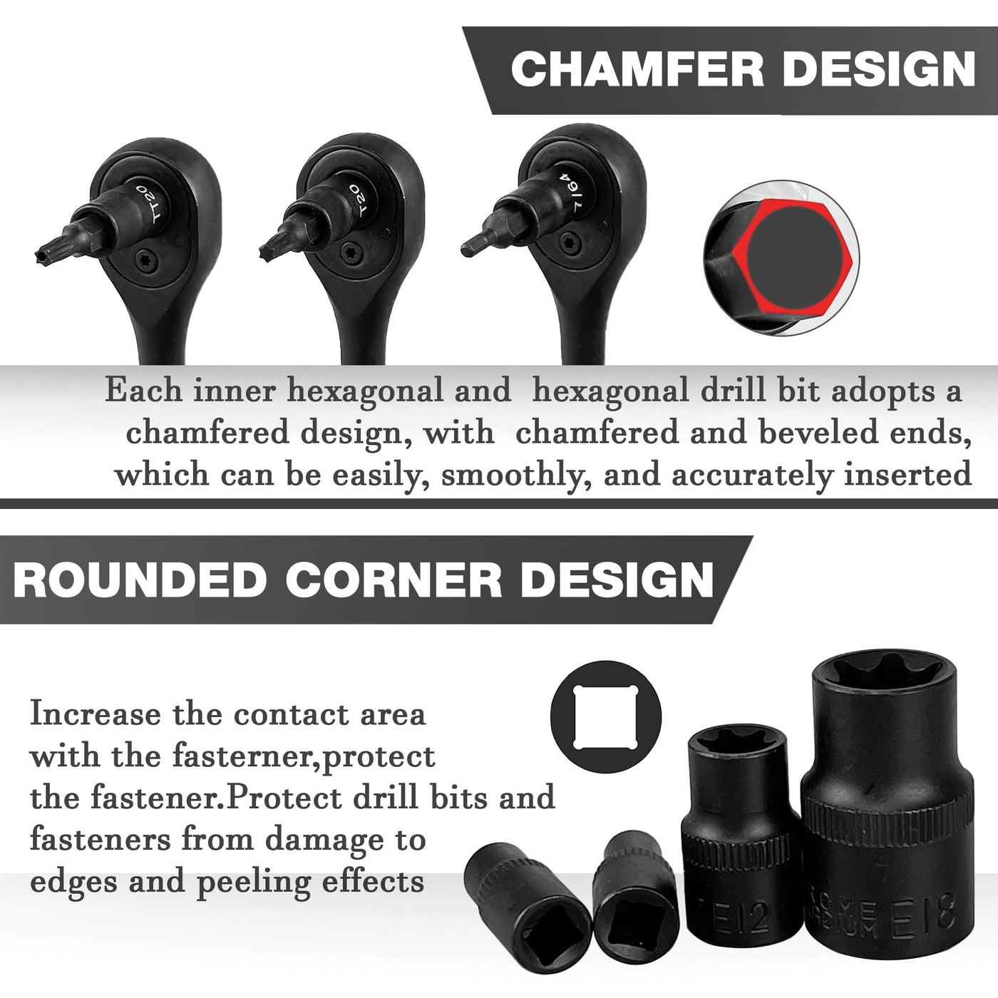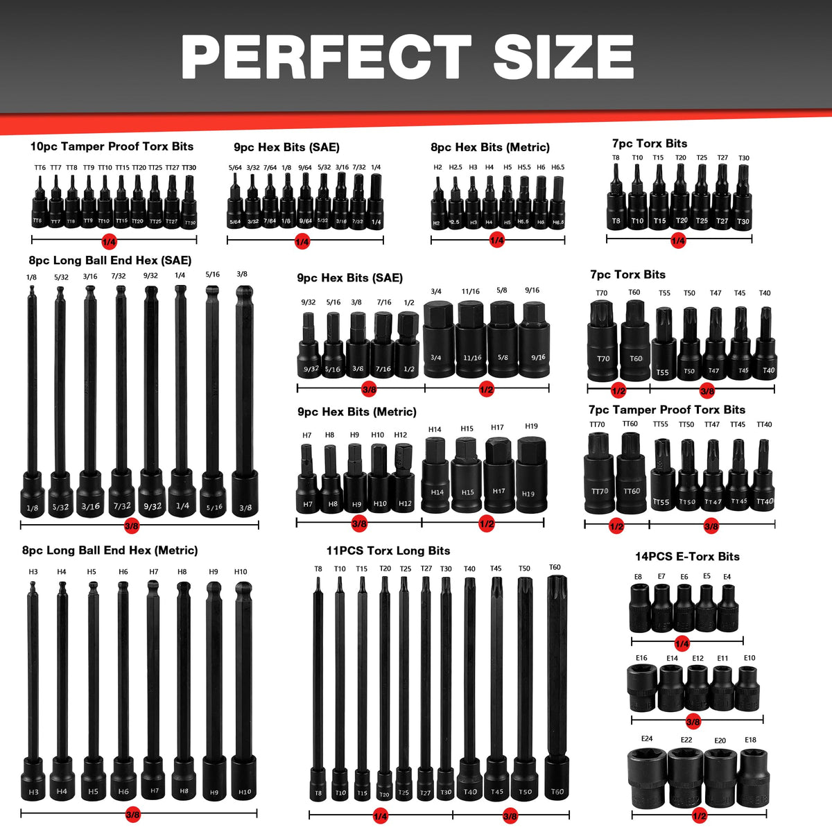 ?What includes?The1/4”,3/8 & 1/2” Drive Bit Socket Set include:14PCS E-Torx Bits,17PCS Hex Bits (Metric),18PCS Hex Bits (SAE),17PCS Tamper Proof Torx Bits,14PCS Torx Bits,11PCS Torx Long Bits,16PCS Long Ball End Hex. ?Material?The 107pcs Bit socket sets are made of high quality S2 steel and CR-V steel, the socket is made of chrome vanadium steel. ?Surface?The surface of drive bit socket set is coated with premium black powder coating of rust prevention and corrosion prevention, with strong corrosion resistance. ?Design?Each allen and hex bit use chamfering design with chamfered, bevelled ends that allow for easy, smooth, and accurate insertion that protects the bits and fasteners from damaged edges and stripping. ?Easy to Install?The bit sockets come with a sturdy and convenient storage box for easy transport, safe storage and quick organisation.