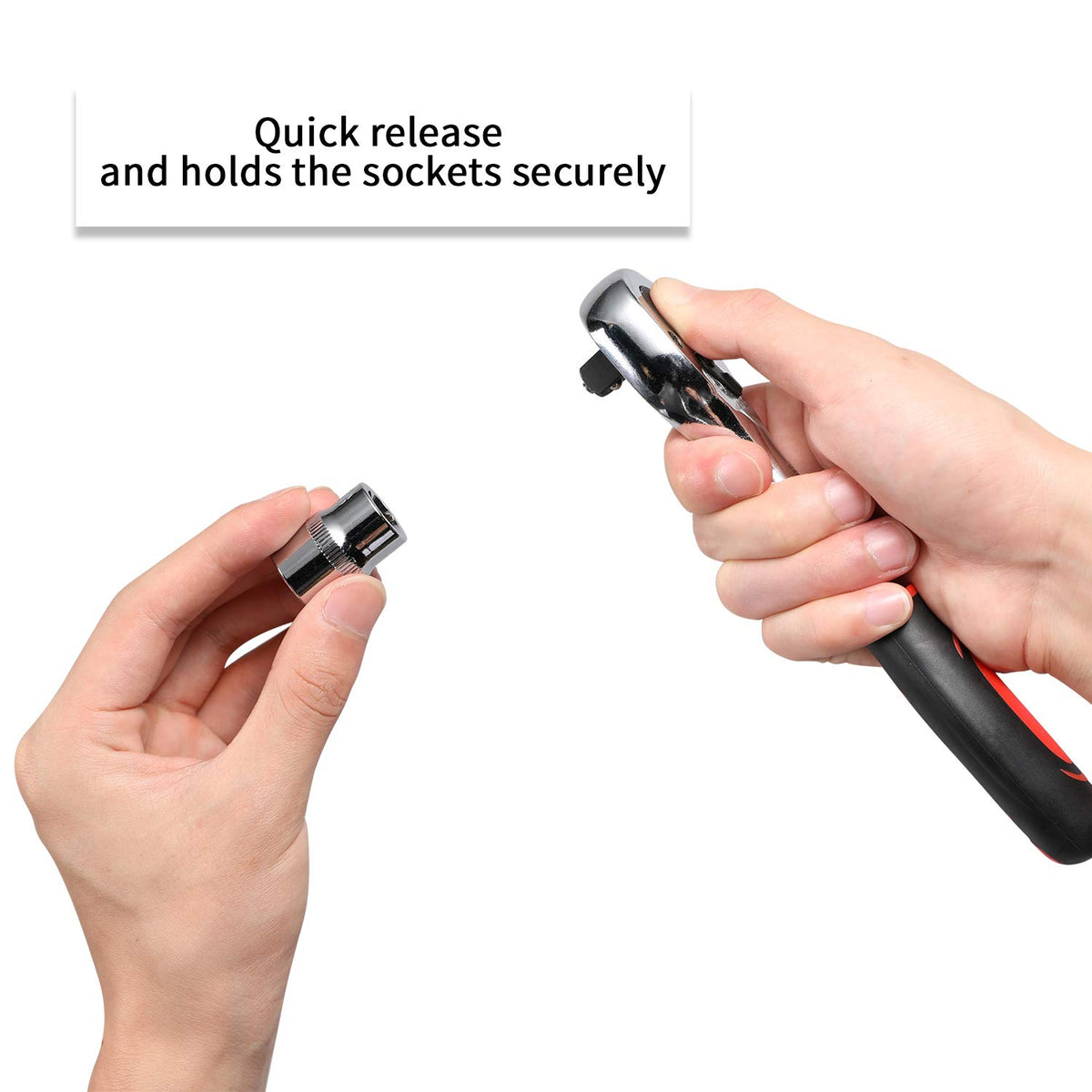 Q: Is the ratchet handle reversible and easy to use?A: Yes, the ratchet handle is reversible, allowing for both clockwise and anti-clockwise rotation. It features an ergonomic design for comfortable grip and a quick-release button for easy socket changes.