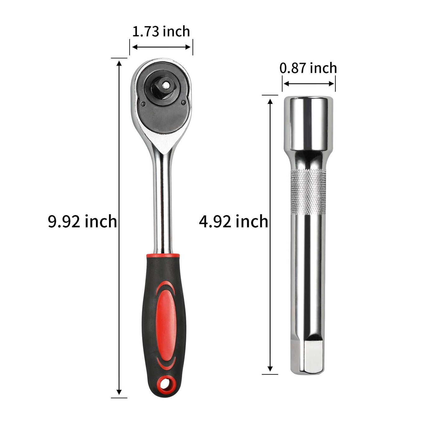 Size:1/2 metric 1/2 Inch Socket Set Include: ?10 x 1/2' Dr Metric Socket :10,11,12,13,14,15,17,19,22,24 mm ?1 x Dr.Extension Bar:4.9' ?1 x Dr.Quick release ratchet handle Advantages: Made from forged and heat treated chrome vanadium steel construction, provide you longer service life even under high pressure work. Included 4-Inch extension bar help you reach the hard places. Thanks for the 24-tooth oval head ratchet which needs only 15-degree swing arc and the quick-release drive tang prevents dropped sockets. The reversible ratchet turns both clockwise and anti-clockwise and has a quick release button for changing the socket easily.