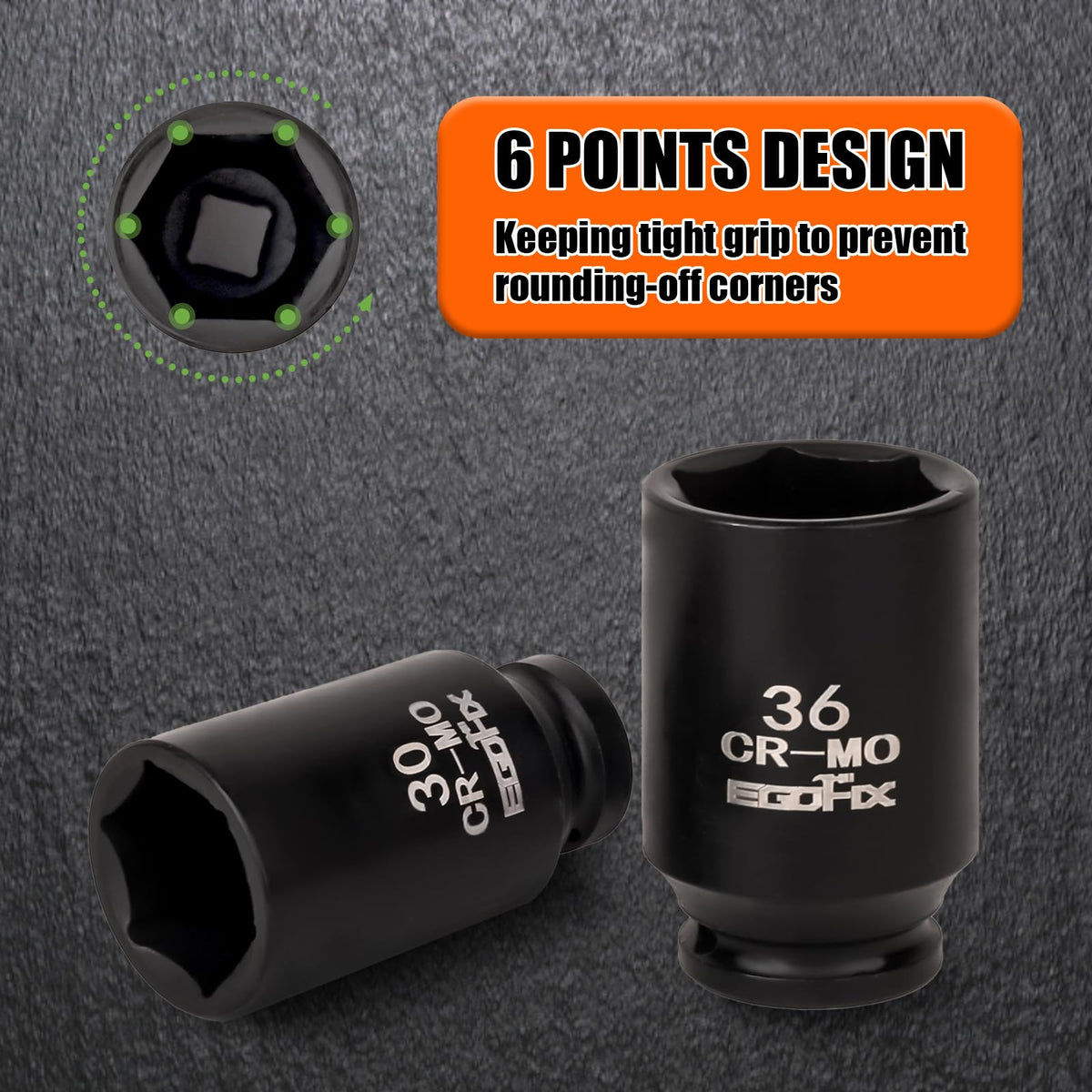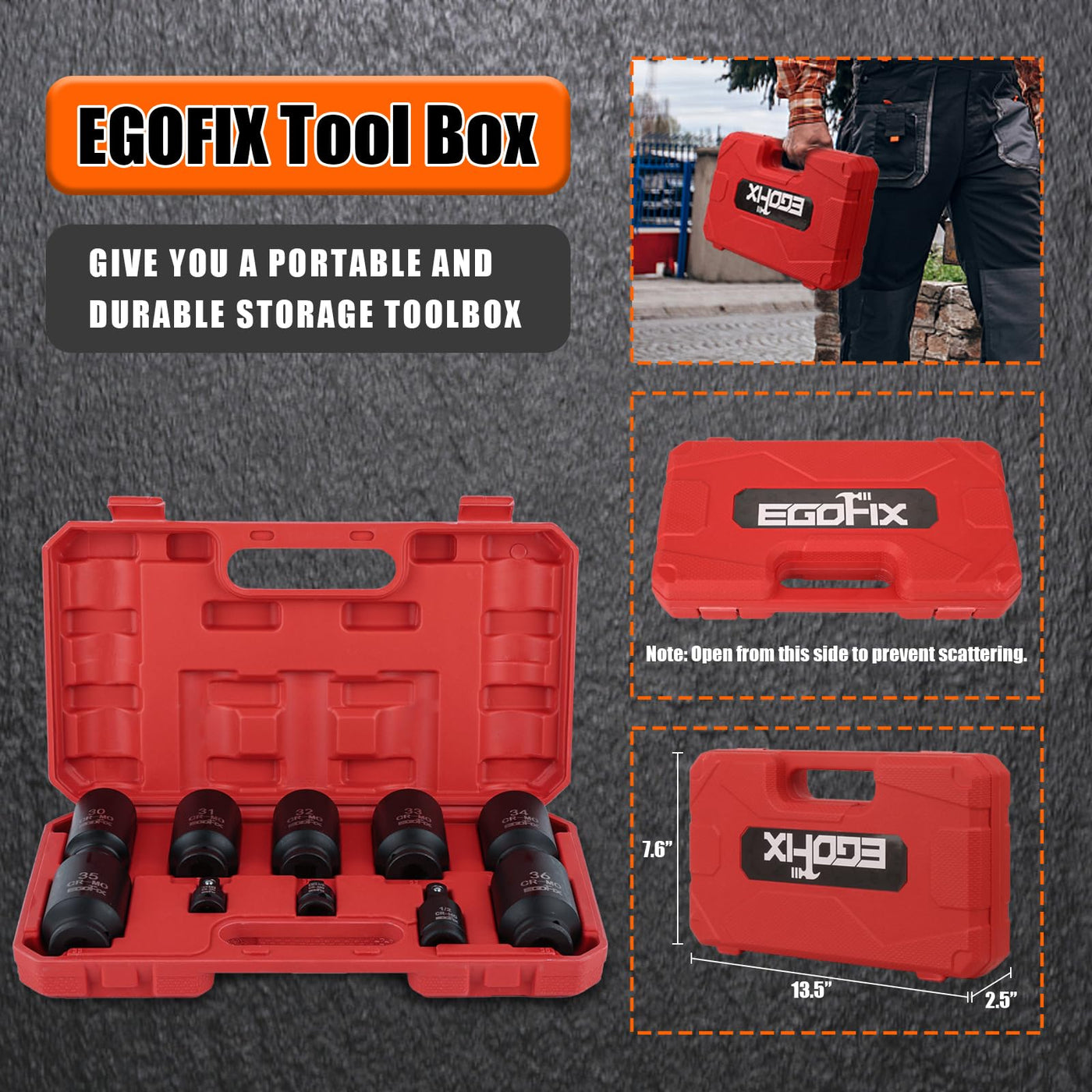 Q: What sizes are included in the EGOFIX 1/2" Drive Deep Impact Socket Set?A: The EGOFIX 1/2" Drive Deep Impact Socket Set includes 10 pieces with sizes ranging from 30mm to 36mm, including 30mm, 31mm, 32mm, 33mm, 34mm, 35mm, and 36mm sockets.