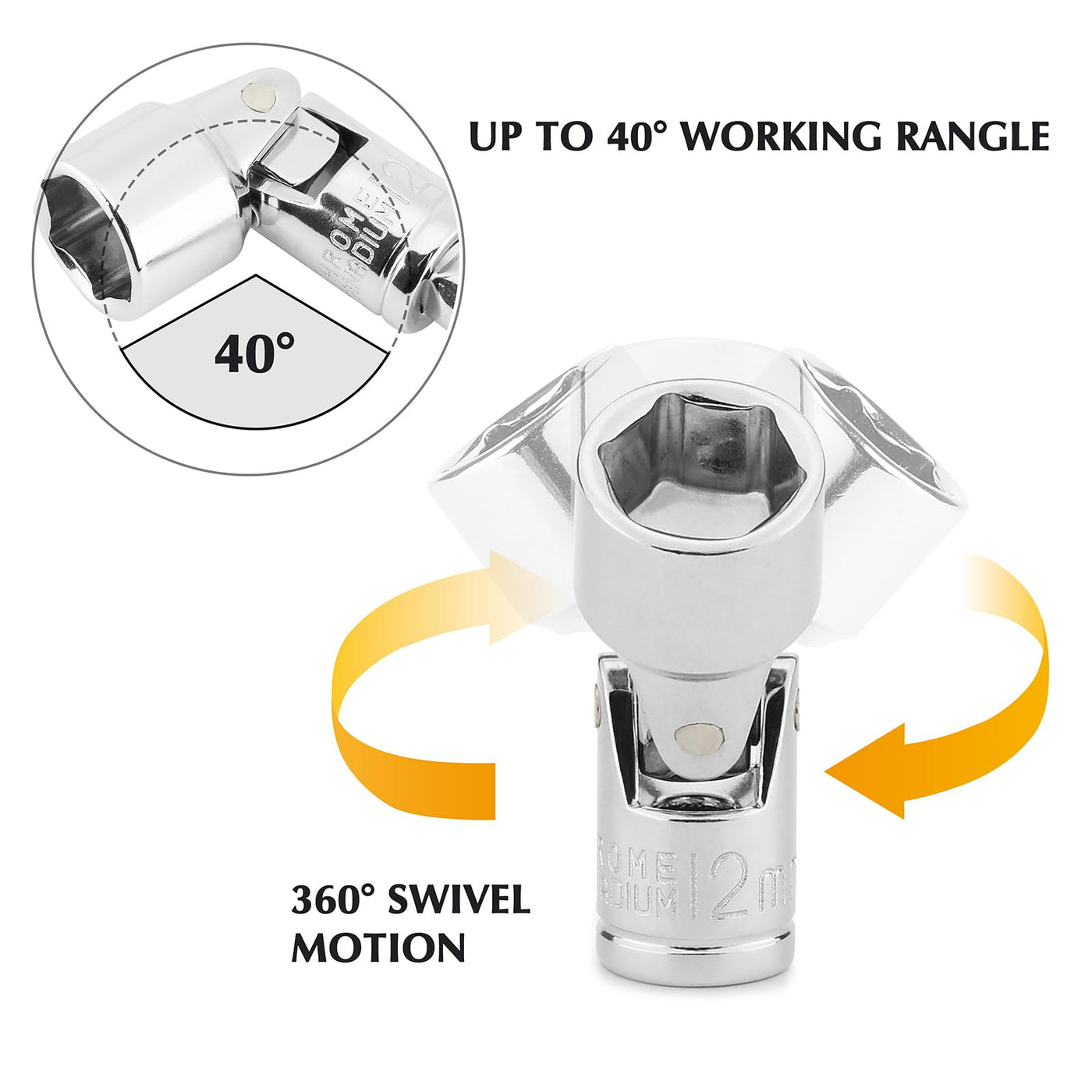 Q: How does the flexible design of the sockets benefit users?A: The flexible design allows for a 40-degree working angle and 360-degree rotation, making it easier to access and work on tight or difficult spots, enhancing the efficiency of your tasks.