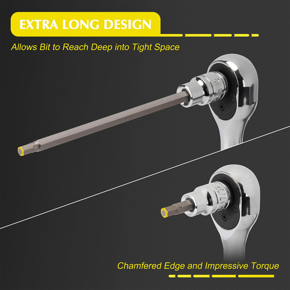 Q: How does the design of the EMENTOL Hex Bit Socket Set improve usability?A: The extra-long design of the hex bits allows them to reach deep into tight spaces, while high contrast size markings enable quick and easy identification, making it simpler for users to select the correct size.