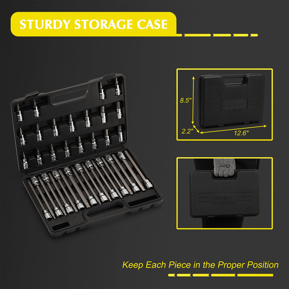 Q: How should I care for and maintain my EMENTOL Hex Bit Socket Set?A: To maintain your EMENTOL Hex Bit Socket Set, keep it in the provided sturdy storage case to prevent damage, and regularly clean the bits to remove dirt and grease to ensure optimal performance.