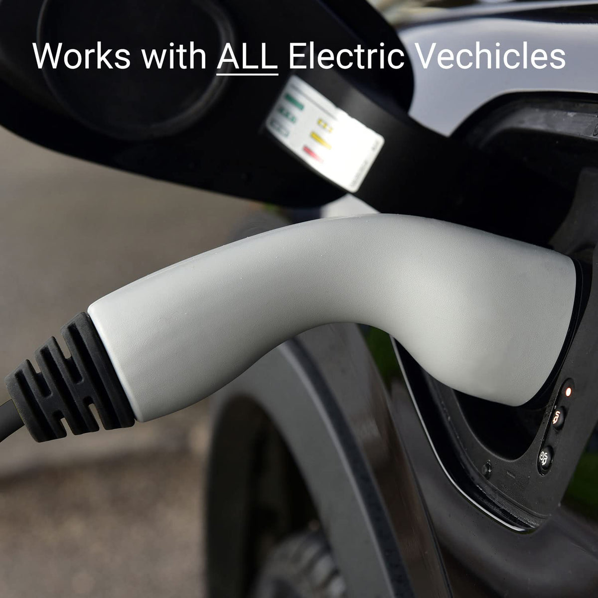 Q: What vehicles are compatible with the EMPORIA Level 2 EV Charger?A: The EMPORIA Level 2 EV Charger is equipped with a secure SAE J1772 connector, making it compatible with all EVs in North America, including Tesla models, Chevrolet Bolt, VW ID 4, Nissan Leaf, Ford Mustang Mach-E, IONIQ 5/6, BMW i3/i4/iX, Audi, and Jeep Wrangler 4xe.