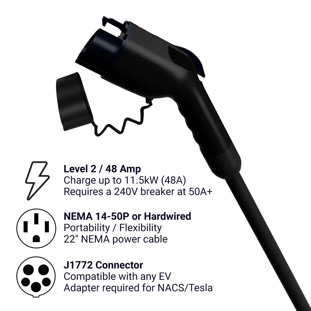 Up To 9X Faster Charging Speed: The Emporia Electric Vehicle Charger Provides Up To 46 Miles/Hour Charging Speed Via Hardwired Connection (48 Amp - Up To 9X Faster Than A Standard Wall Outlet) Or Up To 38 Miles/Hour Via The Nema Plug (40 Amp). | Versatile Installation Options: Preconfigured For Nema Type 14-50P Compliant With 2017 Nec Section 625.17 For Up To 40A Or Convert To Hardwired For Up To 48A. Professional Installation Recommended For Optimal Safety And Performance. | Safety, Certification, And Peace Of Mind: Ul Listed And Energy Star Certified, Meeting Stringent Standards (Nec 625, Sae J1772, Ul 817, Ul 991, Ul 2231, Ul 2251, And Ul 2594). | Get The Benefits Of Smart Charging: Connect Via 2.4 Ghz Wifi To Access Real-Time Energy Data And Manage Charging From Your Mobile Device. Schedule Charging Sessions To Optimize Utility Rates And Performance. | Universal Compatibility: Equipped With A Secure Sae J1772 Connector, Compatible With All Evs In North America, Including Tesla, Chevrolet Bolt, Vw Id 4, Nissan Leaf, Ford Mustang Mach-E, Ioniq 5/6, Bmw I3, I4, Ix, Audi, And Jeep Wrangler 4Xe.