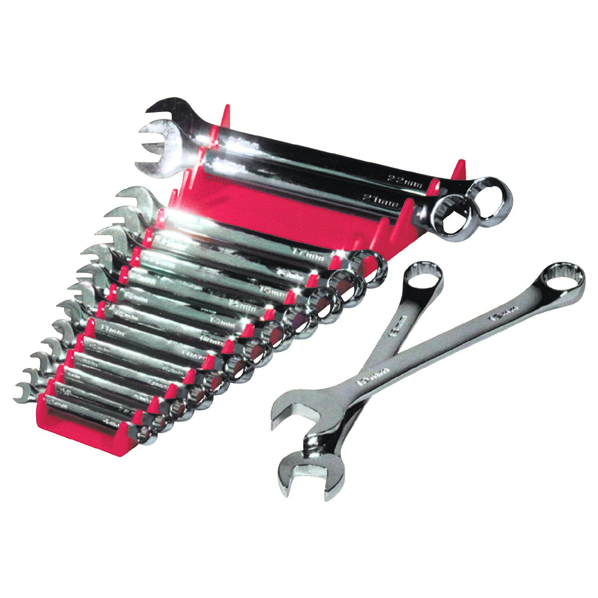 Q: What sizes of wrenches does the Ernst 5060-Red Wrench Organizer accommodate?A: The Ernst 5060-Red Wrench Organizer is designed to fit a standard set of 16 wrenches, effectively accommodating various sizes for efficient and secure storage.