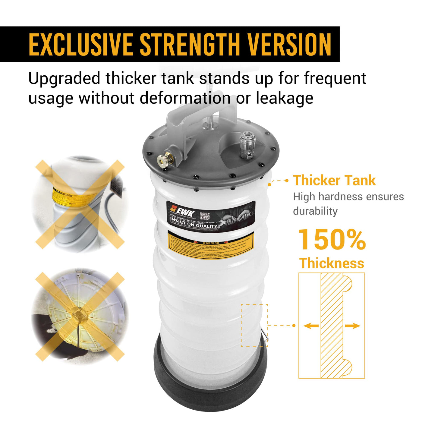 ? Multi-Function ?Ewk 12L Heavy Duty Manual Oil Extractor/Dispenser Is Suitable For V6-V12 Engine Vehicle Owners Or Professional Mechanic. No Need To Lift Up Or Crawl Under The Car Ever And Get Your'S Hand Dirty, The Engine Oil, Power Steering Or Transmission Fluids Can Be Changed Wherever Without Hassle Or Mess. | ? Exclusive Features ?This Strengthened Version Evacuator Comes With A Thicker And Translucent Tank Stands Up For Frequent Usage Withount Deformation Or Leakage And Monitors Fluids Level Easily. The Pump Eqipped With Extract And Dispense Mode, Saves Your Effort From Dumping A Tons Of Old Fluids. | ? The Safest Option ?This Upgraded Evacuator Built With A Pressure Gauge And Decompression Valve Allows To Check The Inside Vacuum Pressure While Operating, Avoids Damaging The Extractor From Over Pressure. Ensures The Operator The Safest Working Experience. | ? Wide Application ?No Limited To Places, Change Oil Anytime & Anywhere! Perfectly Extracts Most Types Of Fluids And Applicable For Car, Motorcycle, Lawn Mower, Boat, Jet Ski And Etc. *Note: Gasoline And Fluids With High Volatility, High Corrosion, High Alkalinity And High Temperature Are Forbidden To Be Used On The Extractor. | ?12+6 Month?Durable Products Backed By An Extraordinary 12+6 Months Warranty.