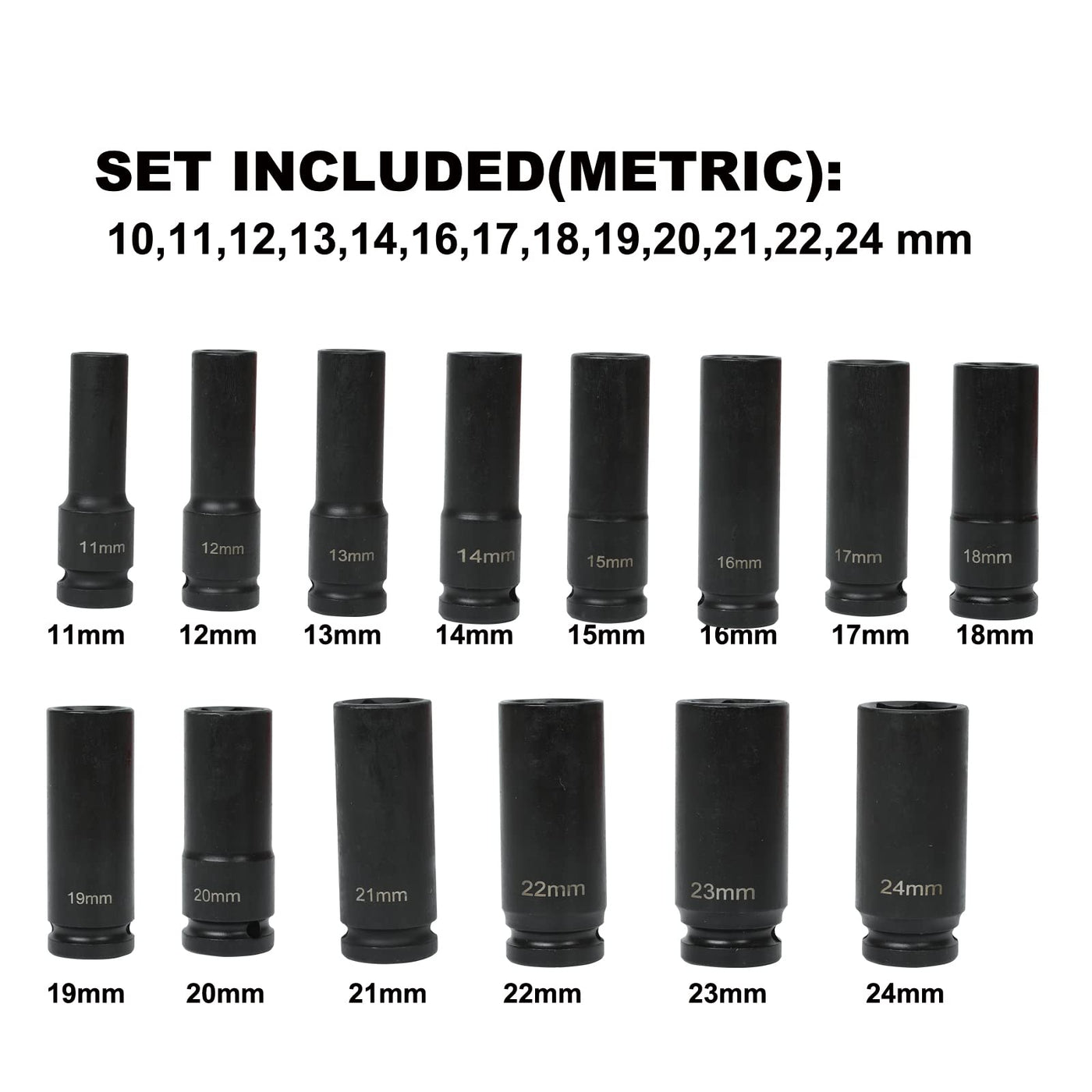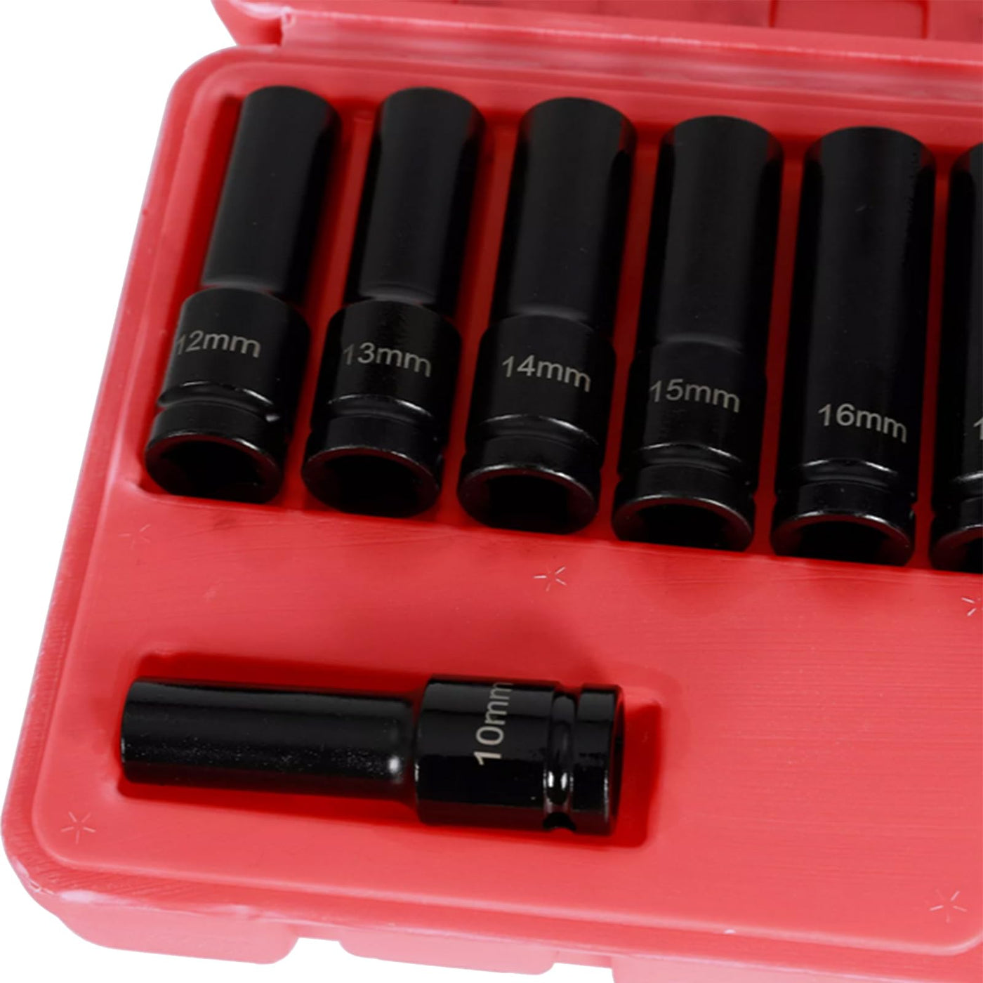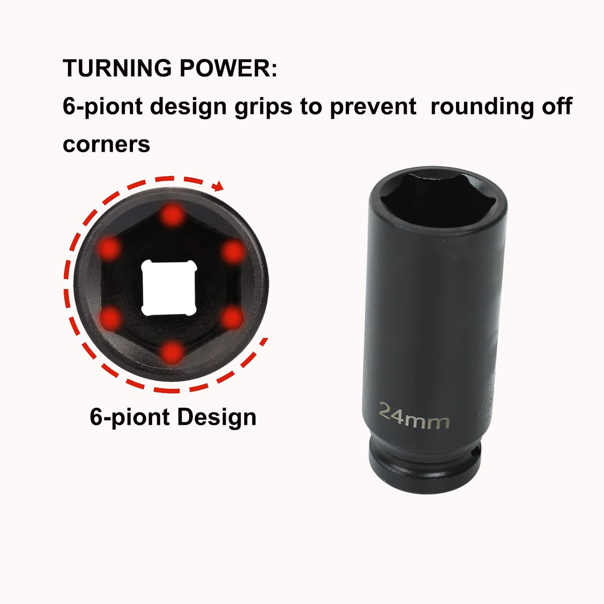 Q: What sizes of sockets are included in the set?A: The set includes twist sockets in various sizes: 17mm, 19mm, 21mm, and 22mm, catering to a range of applications for different vehicles.