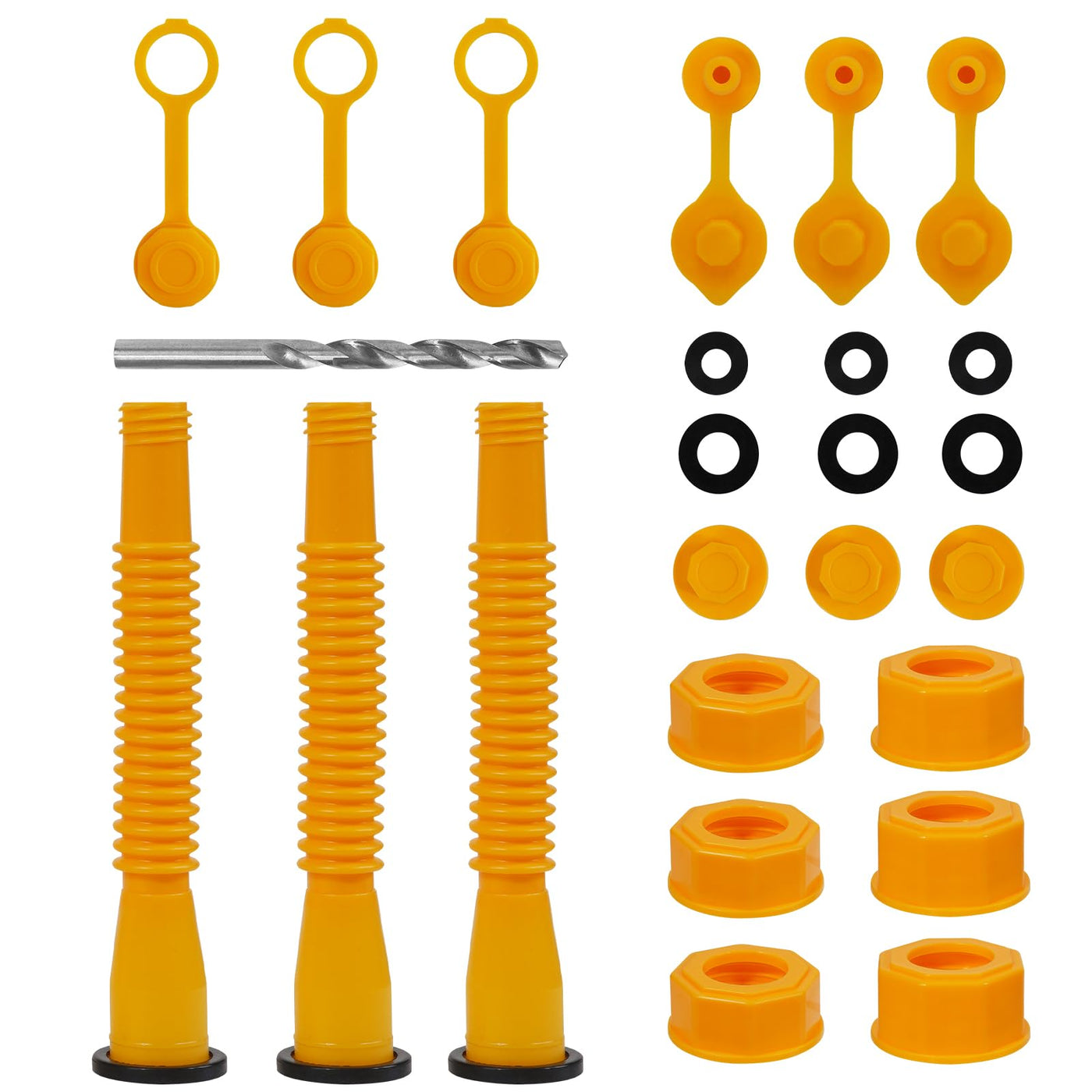 Q: What is included in the Gas Can Spout Replacement Kit?A: The Gas Can Spout Replacement Kit includes 33 pieces such as pour spouts with rubber gaskets, screw collar caps, spout caps, sealing gaskets, gasket stoppers, vent caps, and a drill bit for easy installation.