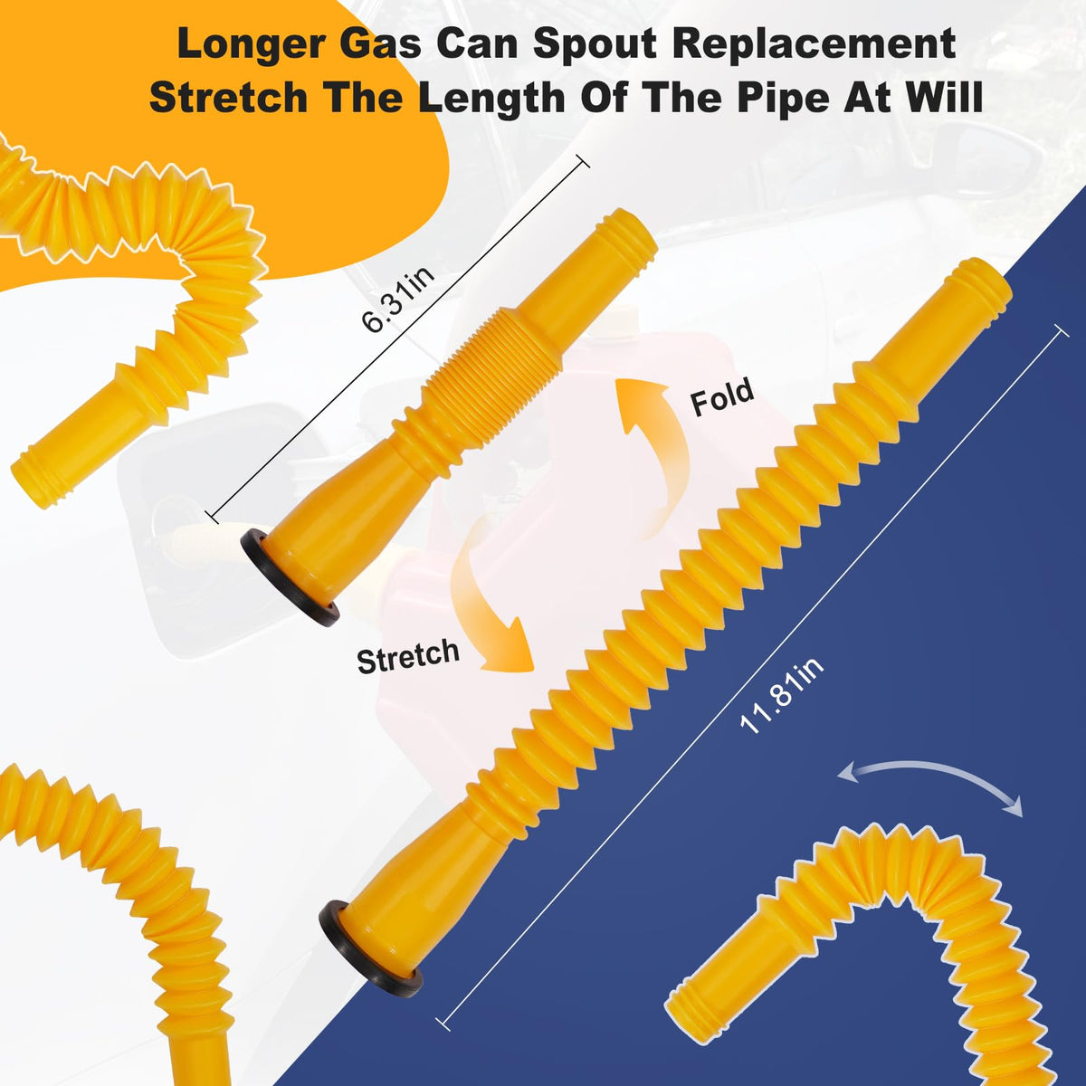 Q: How do I install the gas can spouts from this kit?A: Installation is straightforward. Simply replace your existing gas can spout with the new extended 11.8-inch spout from the kit, ensuring a tight fit with the rubber gaskets and screw collar caps provided.