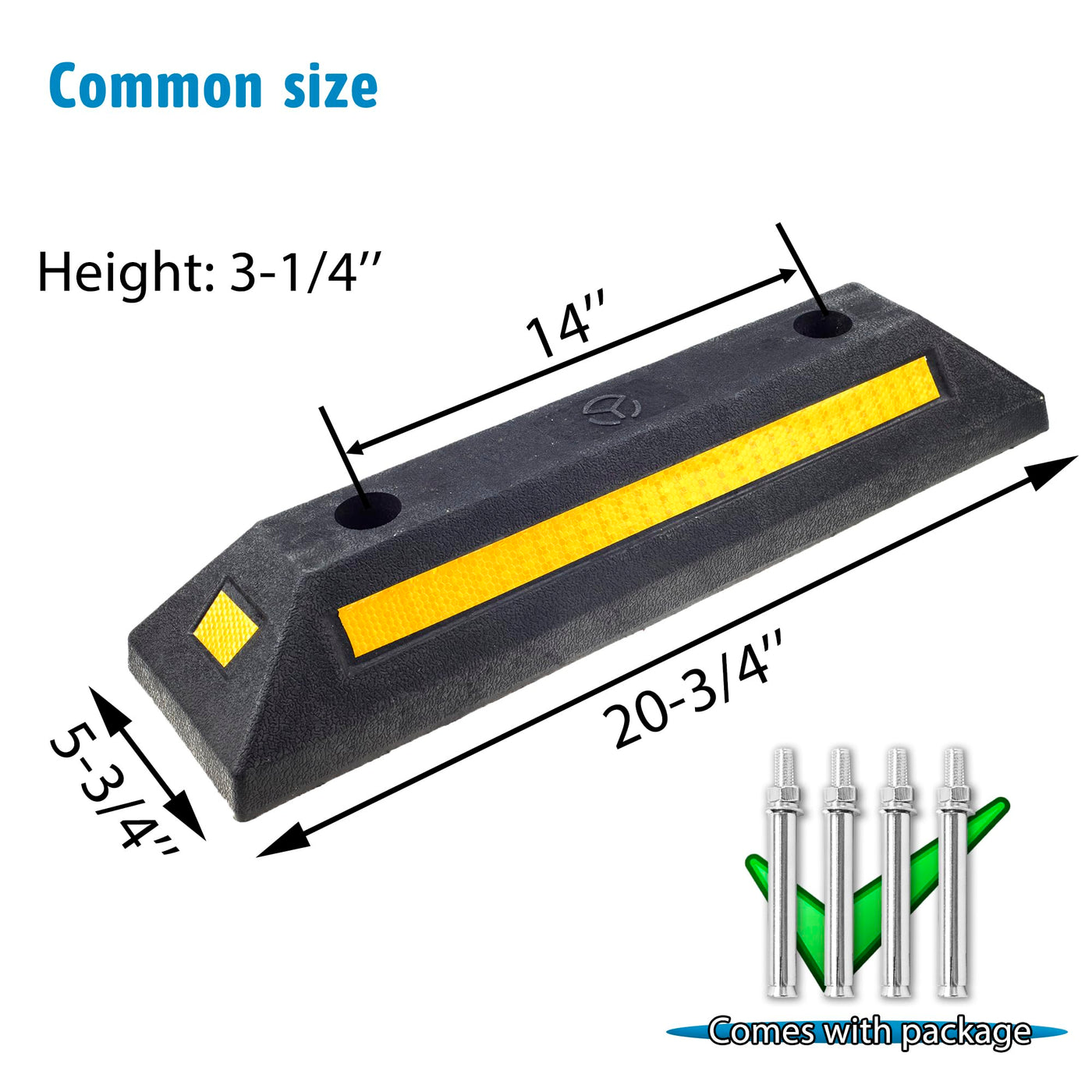 Features: - Strong compression resistance performance and durable. - Reduces impact damage to vehicles when parking. - Conspicuity yellow reflective safety strips to improve the visibility at night. - Easy to remove or relocate, can be installed permanently or temporarily. - Can be used on asphalt or concrete surfaces for any weather condition. - Suitable for indoor or outdoor garage, shopping mall, commercial and business parking lots.