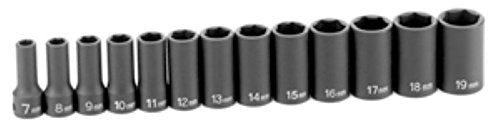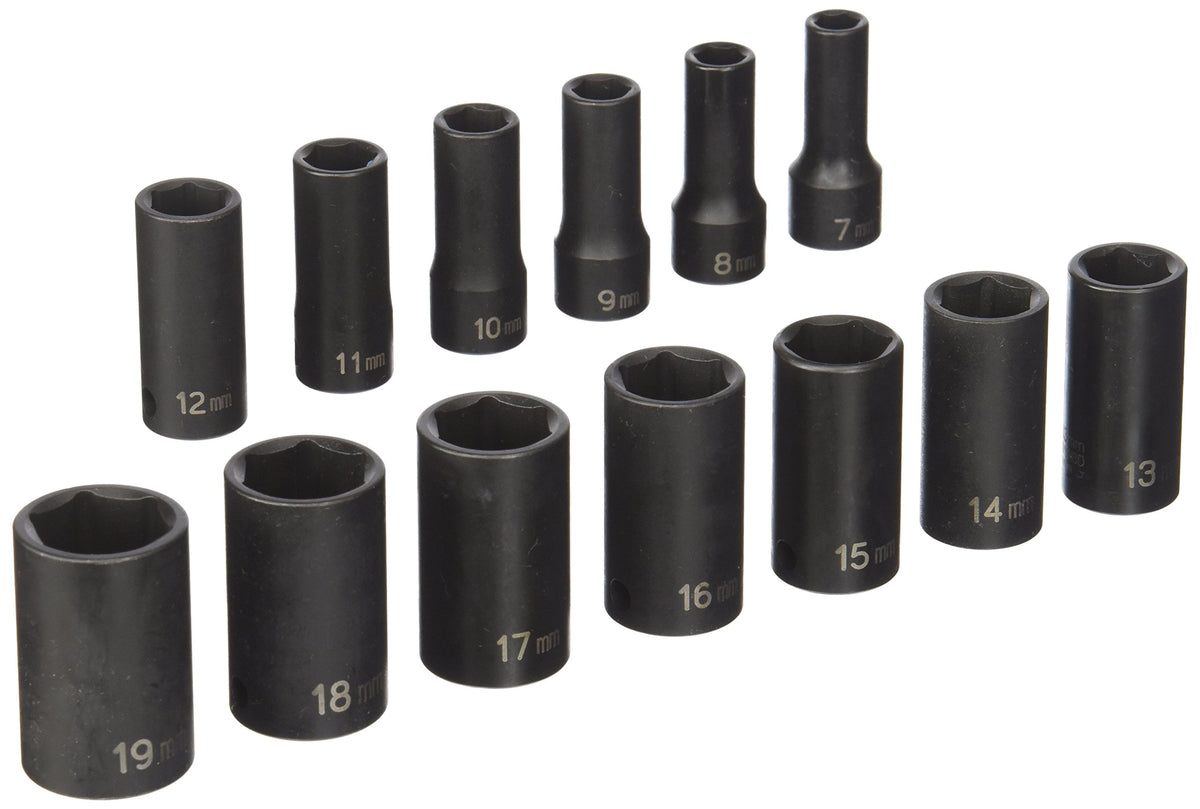 Q: What sizes are included in the Grey Pneumatic 3/8" Drive Semi-Deep Metric Socket Set?A: The Grey Pneumatic 3/8" Drive Semi-Deep Metric Socket Set includes sizes: 7mm, 8mm, 9mm, 10mm, 11mm, 12mm, 13mm, 14mm, 15mm, 16mm, 17mm, 18mm, and 19mm.