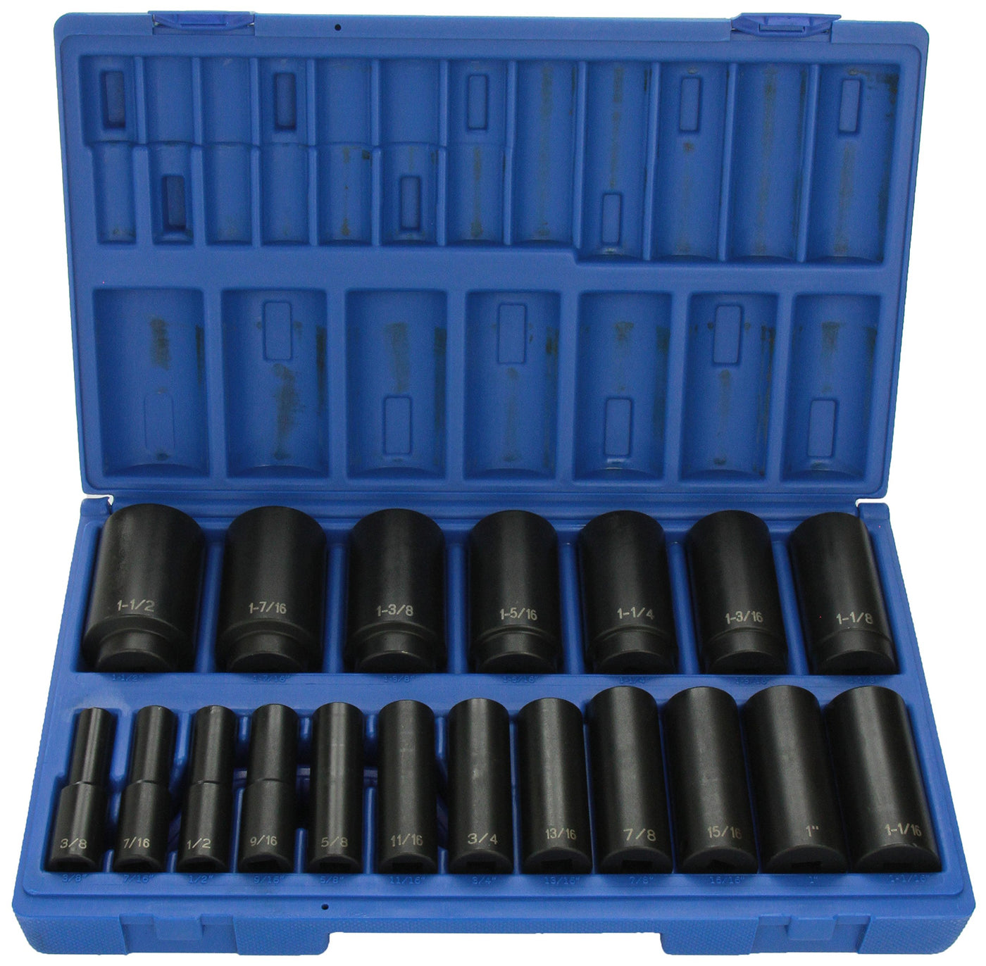 Set contains the following sizes: 3/8', 7/16', 1/2', 9/16'; 5/8', 11/16', 3/4', 13/16', 7/8', 15/16', 1', 1-1/16', 1-1/8', 1-3/16', 1-1/4', 1-5/16', 1-3/8', 1-7/16', and 1-1/2' in deep length.