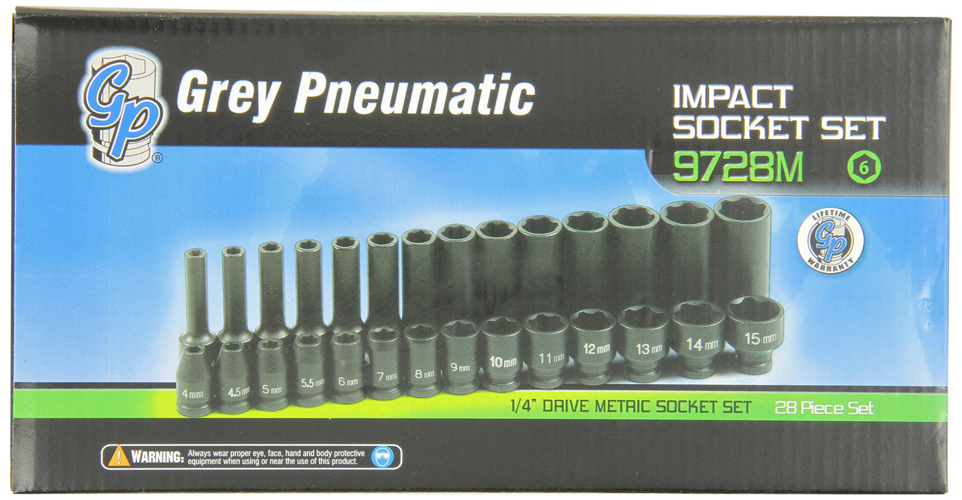 Q: What sizes are included in the Grey Pneumatic 28-Piece Deep Length Metric Master Socket Set?A: The set contains 14 pieces of metric standard length sockets ranging from 4mm to 15mm, including sizes 4mm, 4.5mm, 5mm, 5.5mm, 6mm, 7mm, 8mm, 9mm, 10mm, 11mm, 12mm, 13mm, 14mm, and 15mm.