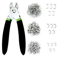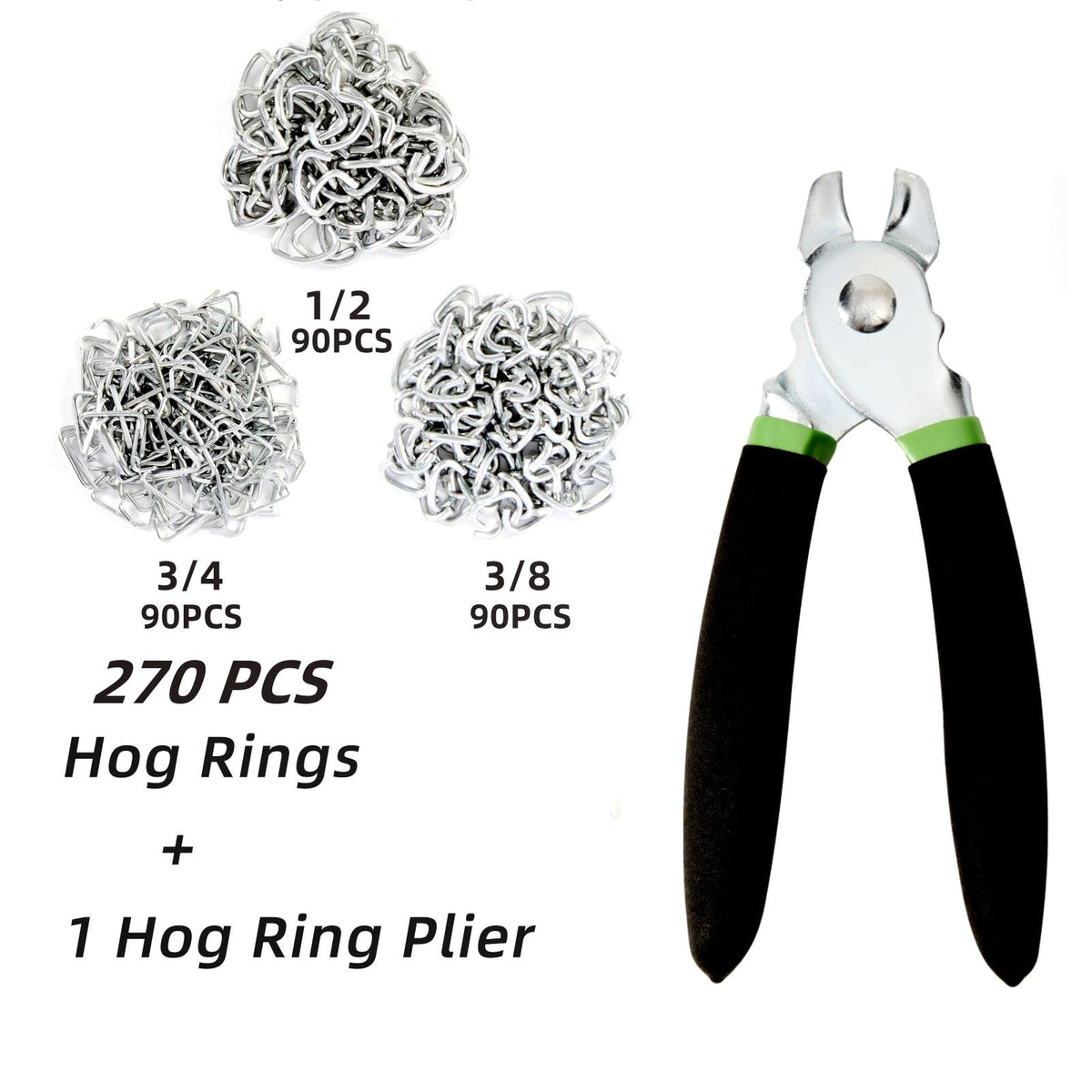 Q: How many hog rings are included in the kit?A: The Hog Ring Pliers Kit includes a total of 270 hog rings: 90 pcs of 3/4", 90 pcs of 1/2", and 90 pcs of 3/8" sizes, providing ample supply for various projects.