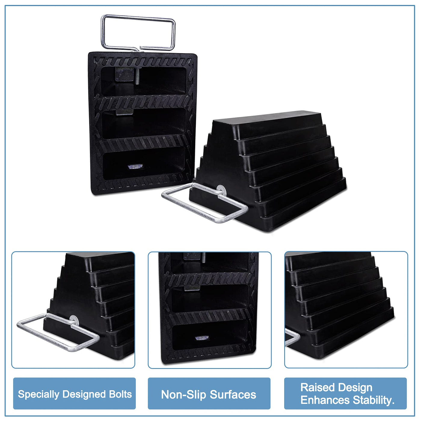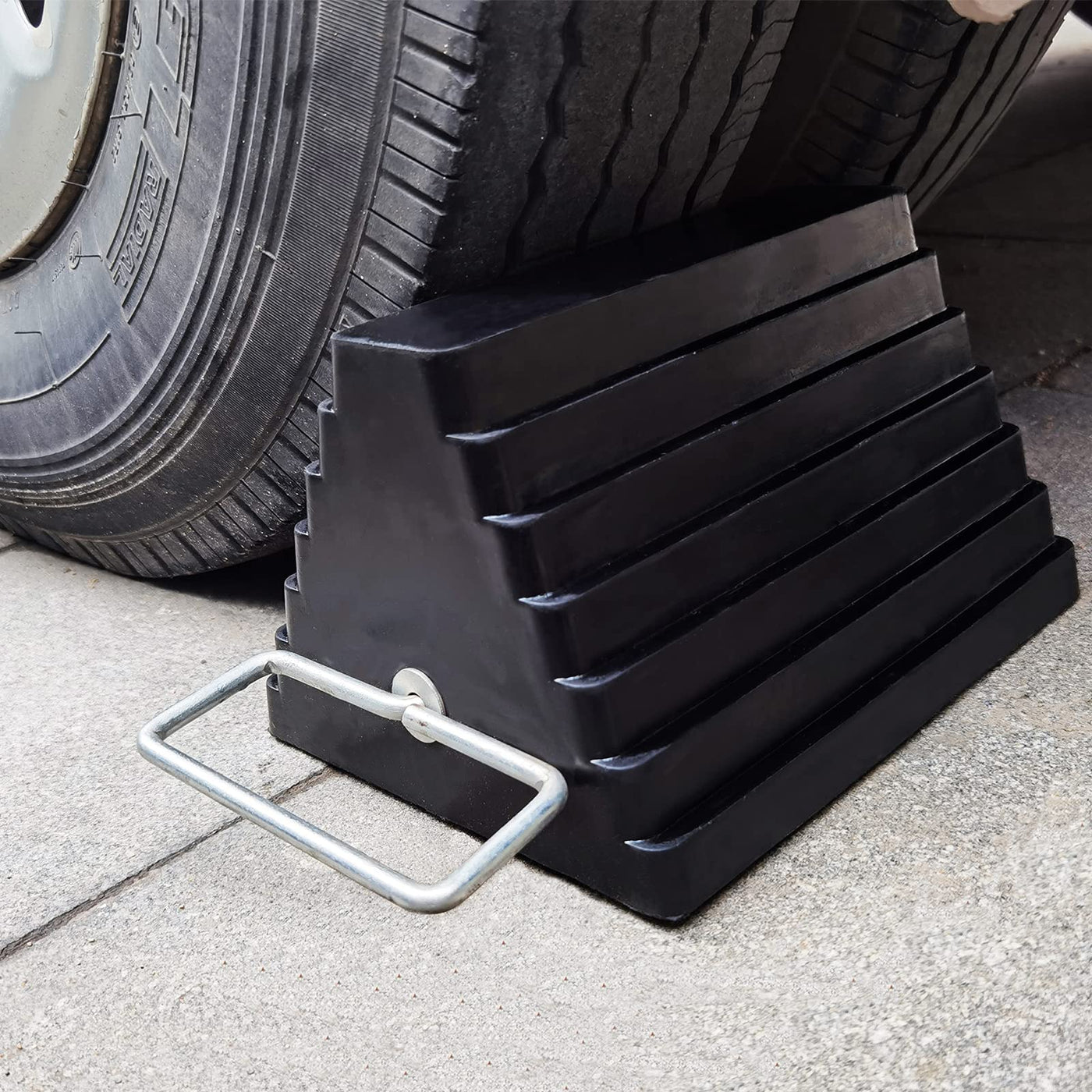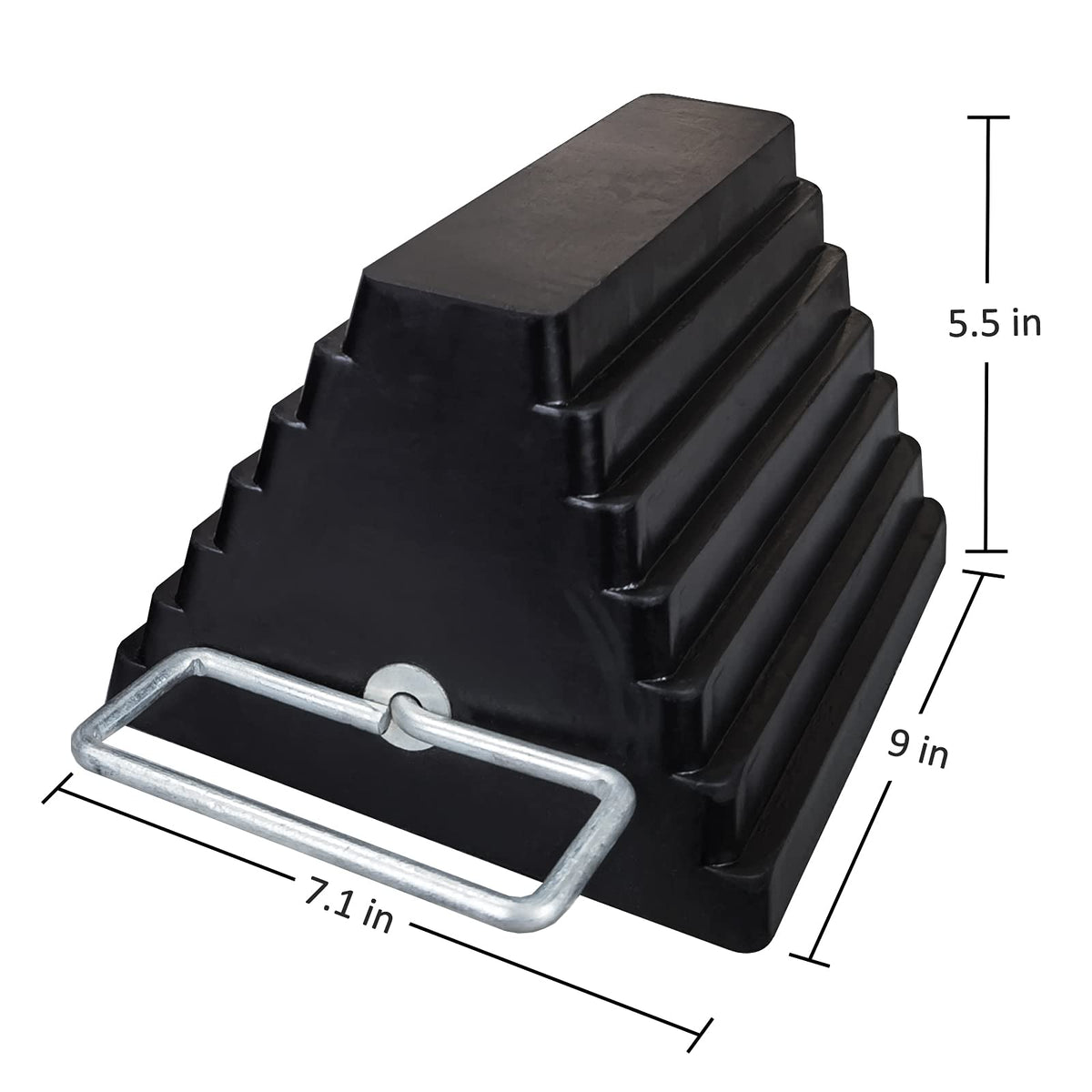 Material Performance: Wheel Chocks Are Made Of Special Rubber, Which Is Durable, Anti-Ultraviolet, And Oil-Resistant The Unique Design Of The Bottom Application Grid Greatly Enhances The Grip And Friction The Scientific Triangle Shape Can Carry More Weight Built-In Magnified Steel Eye Bolts To Connect Chains Or Ropes For More Comfortable And Convenient Grasping &Nbsp; Compatibility: Chocks Are Compatible For Trucks, Private Cars, Trailers, Campers And Other Models The Wheel Bearing Housing Is Suitable For A Variety Of Environments And Can Be Used In Parks, Garages, Highways And Other Places. No Need To Worry About The Sliding Problem Of The Vehicle, You Can Do Your Own Things With More Peace Of Mind &Nbsp; Specification: Size: 9 Inches X7.1 Inches X 5.5 Inches Weight: 13.2 Pounds Quantity: 2 Color: Black