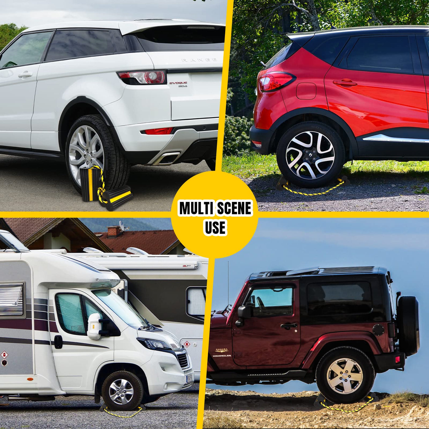 Q: Are these wheel chocks suitable for all vehicle types?A: Yes, these wheel chocks are suitable for a wide range of vehicles including trucks, trailers, RVs, and even small airplanes, making them versatile for various applications.