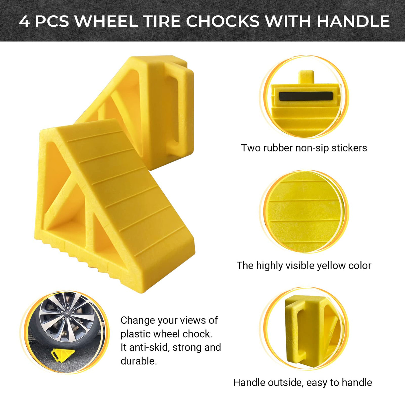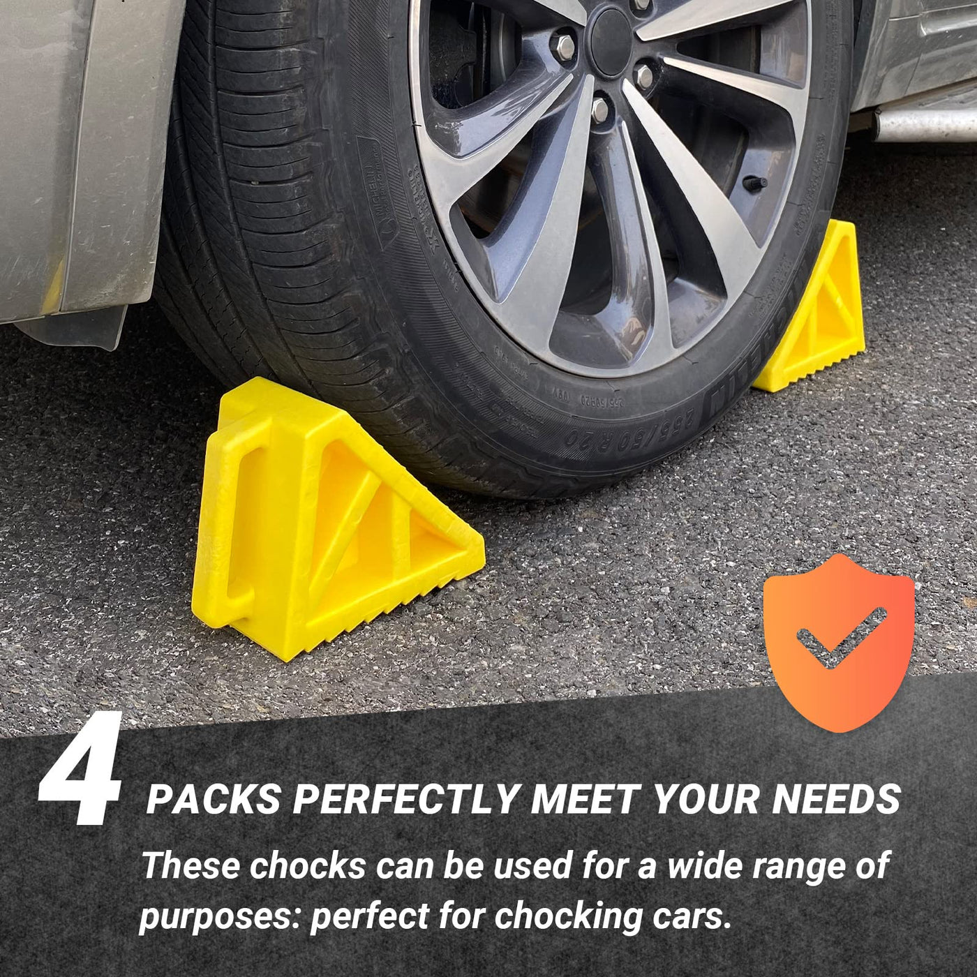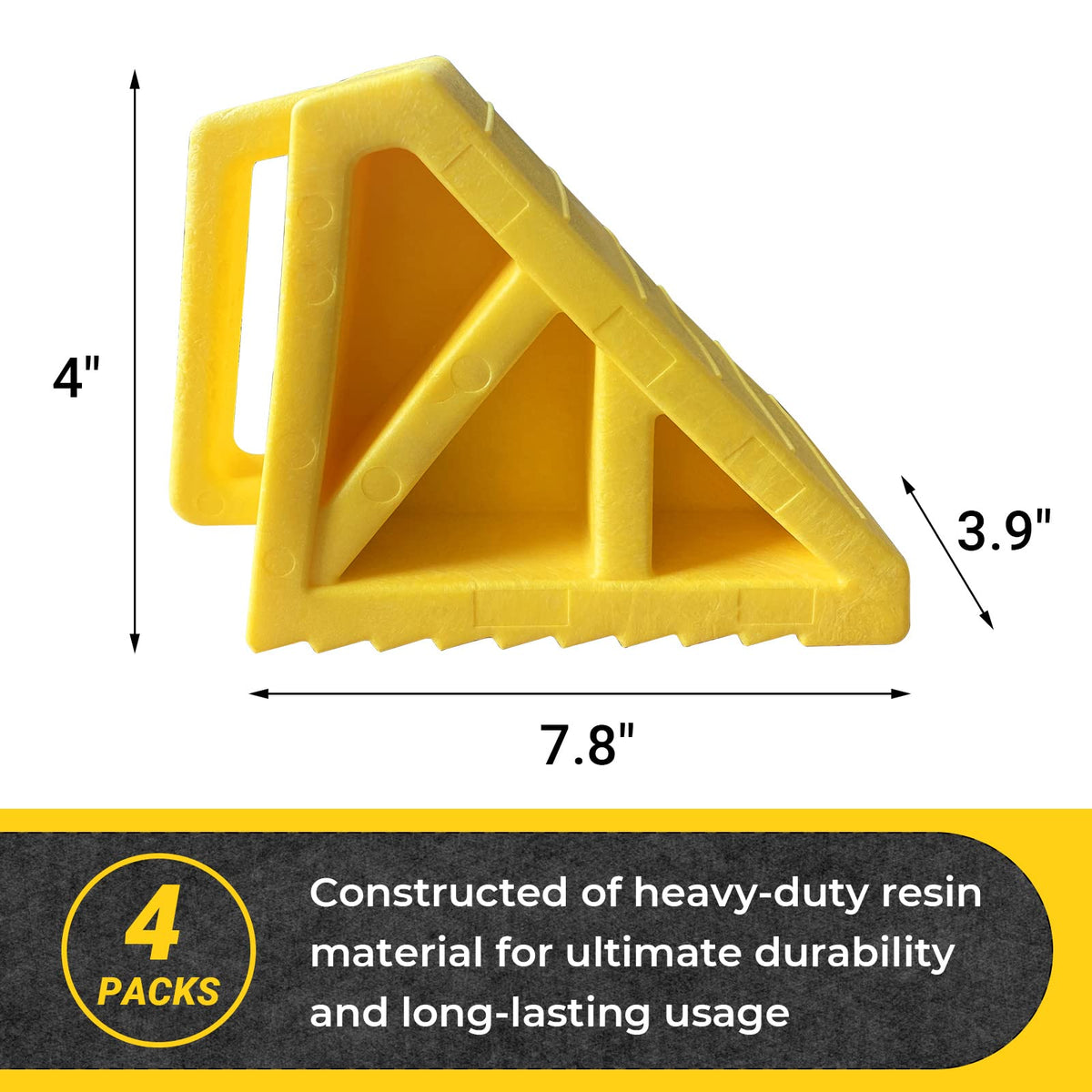 Q: What is the size of each wheel chock in the 4-pack set?A: Each wheel chock in the 4-pack set measures 7.8 inches in length, 3.9 inches in width, and 4 inches in height, making them compact yet effective for various applications.
