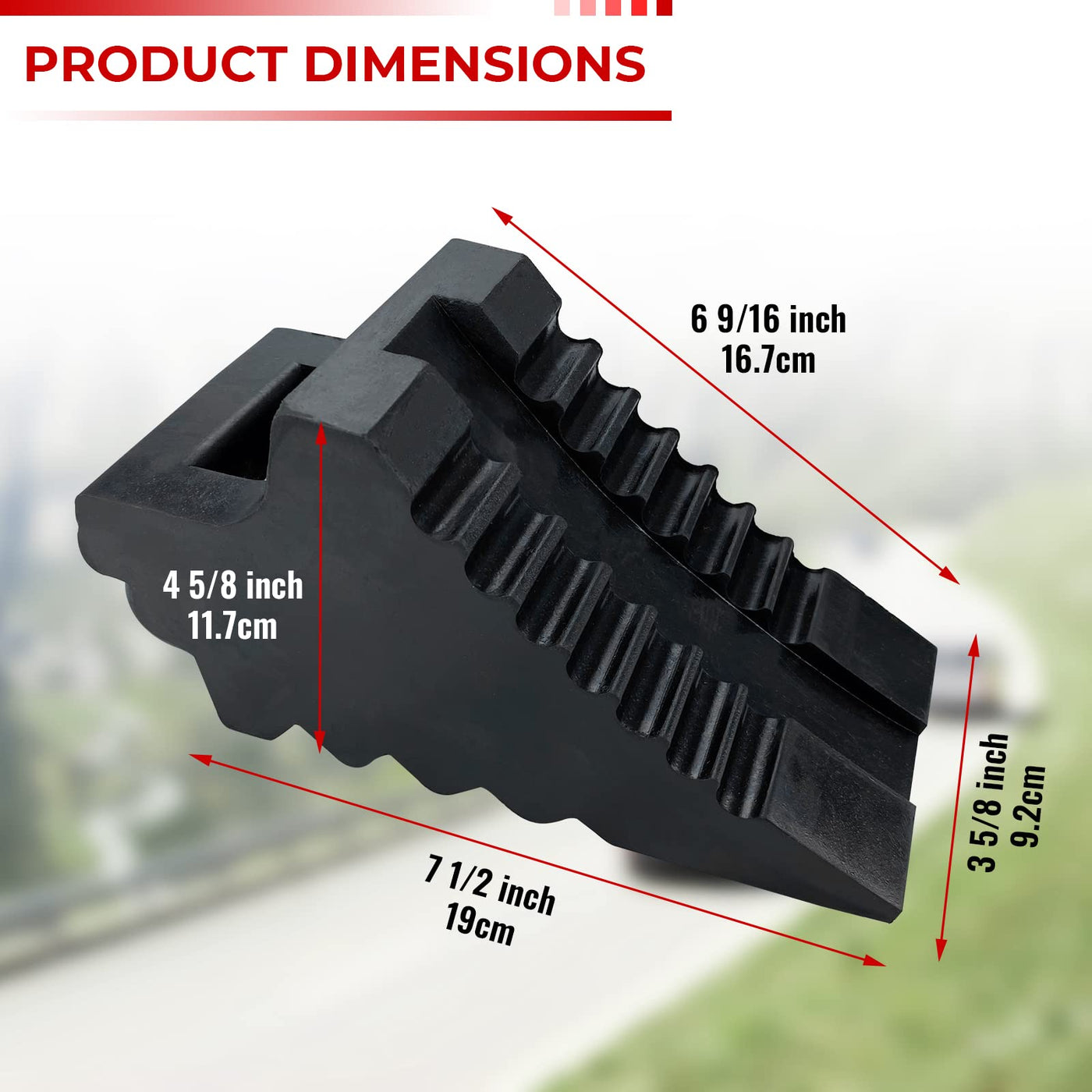 Q: What is the weight and size of each chock?A: Each HOXWELL Wheel Chock measures 7.5 x 3.6 x 4.6 inches and weighs only 3.5 pounds. This compact size makes them easy to store in the trunk, toolbox, or behind the seat of your vehicle.