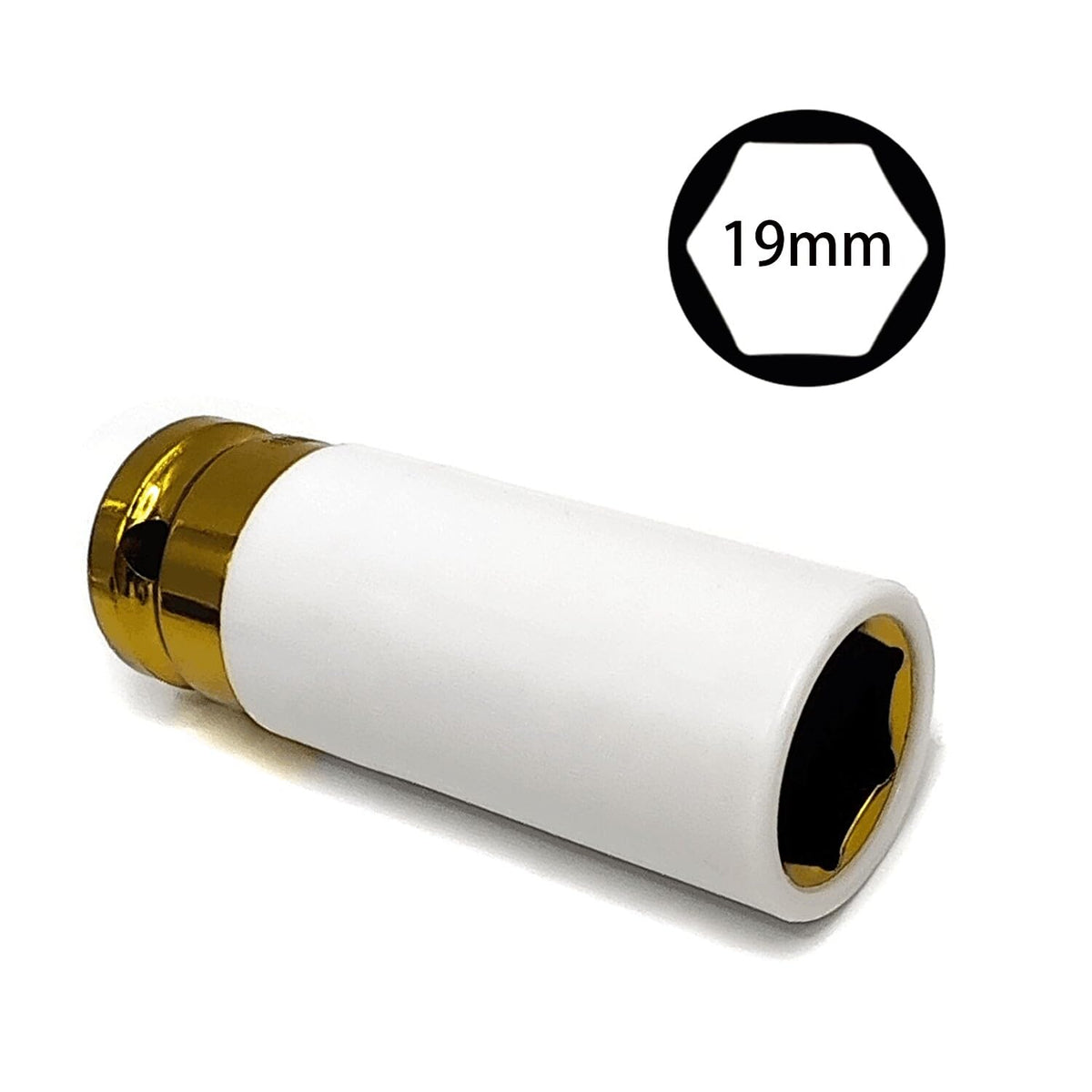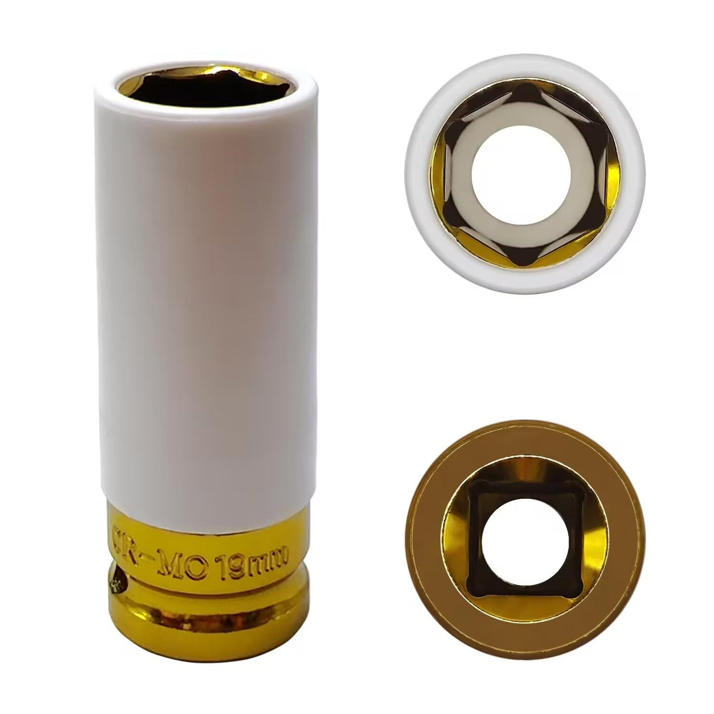 Q: What is the benefit of using the JEUCLEL 19mm 1/2" Drive Wheel Protector Impact Socket?A: The JEUCLEL 19mm 1/2" Drive Wheel Protector Impact Socket is designed to prevent scratches on your vehicle's wheels during tire changes, ensuring a scratch-free operation thanks to its thin-walled construction and scratch-resistant plastic sleeve.